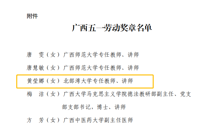 近日,自治区总工会发布《关于授予第八届全区高校青年教师教学竞赛优胜选手广西五一劳动奖章的决定》,授予在第八届高校青年教学竞赛中获得一等奖的5名同志广西五一劳动奖章,我校建筑工程学院黄莹娜老师获此殊荣。