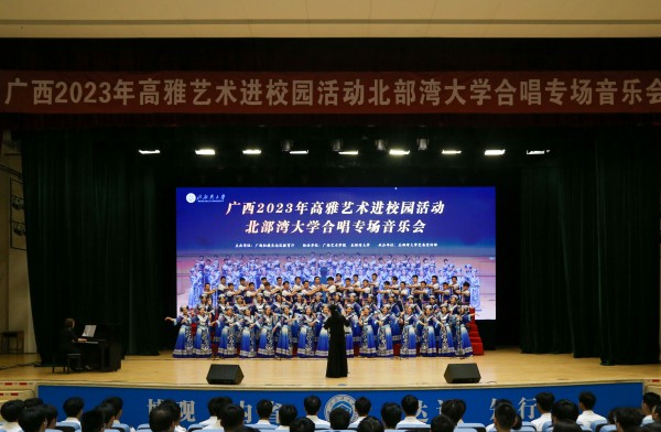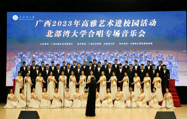 开场即高潮。音乐会以混声合唱《大地飞歌》《壮族敬酒歌》《三月三,九月九》《广西尼的呀》四曲联唱开场,带领观众踏着新时代的旋律走进壮乡,引爆全场;《藤缠树》《山里山外》讲述八桂大地的历史和扶贫攻坚路上的动人故事;《月亮》融合了壮语和流行音乐元素,表达了青年对爱人和家乡的思念之情;《美丽壮乡新时代》《海耕谣》也唱出了少数民族儿女自强不息的生活态度。独唱《天下乡亲》《乌苏里船歌》,混声合唱《沁园春·雪》《阳光路上》……广西艺术学院合唱团通过挖掘本民族音乐元素,用“和谐、清纯、热情、细腻”的演唱风格,以音乐之声、艺术之美的呈现让师生们感受到了各族儿女在党的带领下,铸牢中华民族共同体意识,共同团结奋斗、共同繁荣发展的壮美画卷。