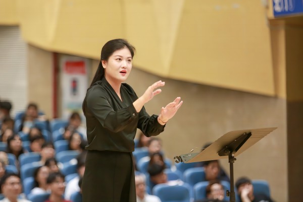 音乐会间隙,合唱团指挥带领合唱团一起为观众科普了不同声部的站位、音色特点等趣味小知识。现场师生热情配合互动、掌声笑声不断,会场再次掀起高潮。