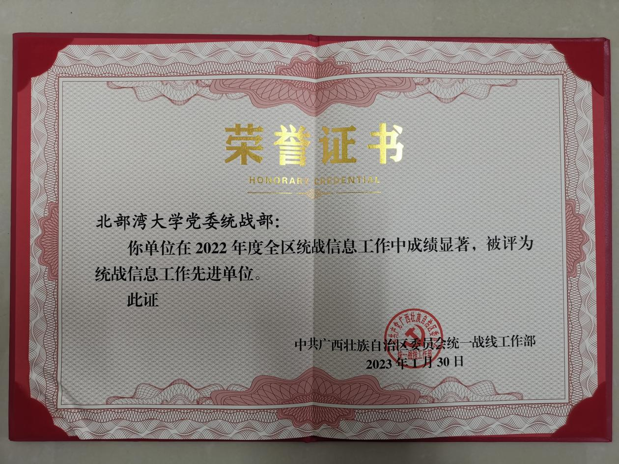 近日,全区统战部长会议在南宁召开。自治区党委书记、自治区人大常委会主任刘宁作批示。自治区党委常委、统战部部长王心富出席并讲话。大会还为获得全国、全区统战信息工作和统战理论政策研究、统战工作实践创新成果奖项的先进单位(个人)进行表彰。我校荣获2022年度全区统战信息工作先进单位。