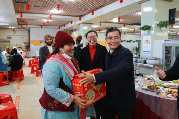 写春联、包饺子、品美食……1月20日,农历腊月二十九,学校东区食堂一楼张灯结彩,一派热闹景象,校党委副书记陈锦山与在校中外师生、校友代表欢聚一堂,互贺新年,共迎新春,整个食堂被融融暖意和欢乐祥和的氛围萦绕,成为了校园里最热闹的地方。