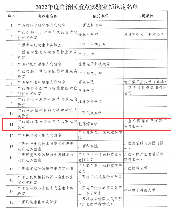 近日,自治区科技厅公布2022年度自治区重点实验室新认定名单,学校“广西海洋工程装备与技术重点实验室”成功获批,成为此次新增认定的18家自治区重点实验室之一,标志着我校在船舶与海洋工程研究领域科研能力和水平迈上一个新台阶。