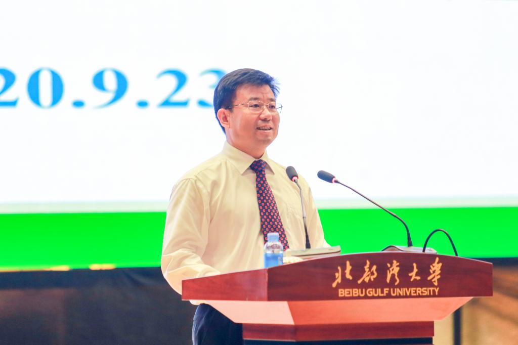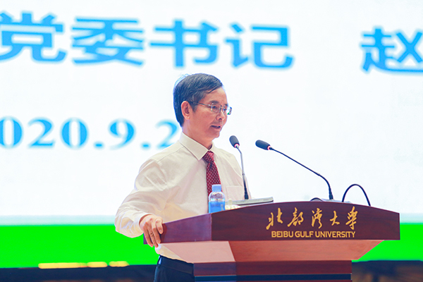 赵君书记用学校发展历程的四个阶段与同学们分享“湾大发展速度”,介绍了我校的多重发展机遇、优质环境与湾大的精神特质。他告诉同学们,北部湾大学的建设历程,是学校全体教职工在继承中发展,在改革中创新,善于用创新的理念来谋划发展思路,用超常规的措施来落实发展目标,敢为人先、敢闯敢试的历程。站在历史的交汇点,赵君书记希望同学们要做一个爱国励志、德才兼修、自强奋进、勤奋好学、会学能干的人。