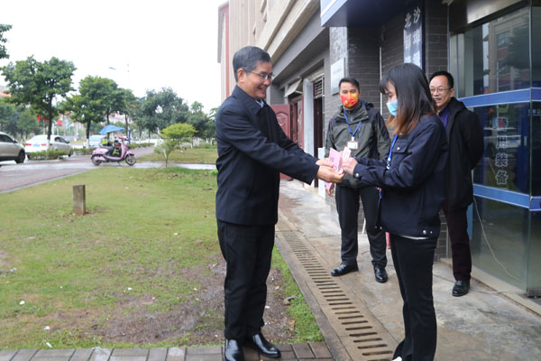 陈锦山一行首先来到东门保卫处警务室看望慰问正在值班的安保人员。执勤人员快速集合,整齐列队。“大家新年好!”陈锦山与执勤安保人员热情打招呼,并送上慰问金。陈锦山对他们一年来团结一心抓好疫情防控,加强校园安全管理等工作表示充分肯定,强调节日期间仍要加强值班值守工作,确保校园秩序安全稳定。在后勤服务集团、学生公寓,陈锦山向在岗人员拜年,送上慰问金。陈锦山表示服务育人是高校育人的重要环节,后勤工作人员是服务育人的重要力量,感谢他们在过去的一年里为师生提供优质公共服务,希望他们在新的一年继续为湾大品质校园建设作贡献。在国际交流处、国际教育与外国语学院,陈锦山与在岗人员一一握手,送上新年祝福。陈锦山表示通过组织“团圆年夜饭”等活动,让留学生对中华优秀传统文化有更深入的了解,希望国际交流处、国际教育与外国语学院继续为学校国际化发展发挥好示范带动作用、做好中华优秀传统文化的传播人。