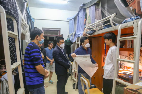 陈湘如一行先后来到人文学院中文本201班、陶设学院坭兴陶协会学生宿舍,实地查看了联系班级和社团学生的网课纪律、宿舍环境以及卫生情况,细致了解同学们的学习生活、思想动态和实际需求。