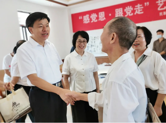 当天的作品展中,陶设师生与艺术家们热情交流创作体会。钦州市委书记、城市品质提升行动指挥部总指挥长许永锞也来到现场,他在参观作品展时与我校师生亲切交流,并勉励大家“努力创作,生动讲好钦州故事,让传统文化活起来。”