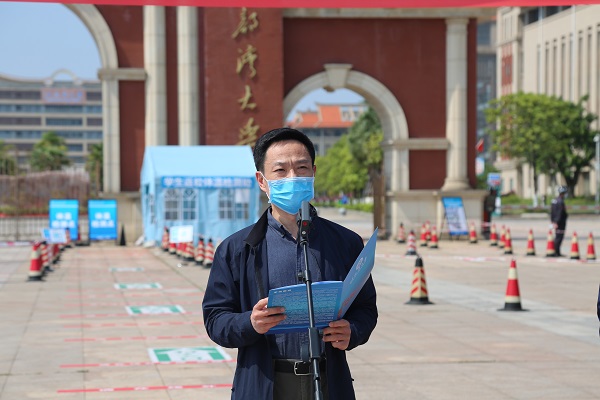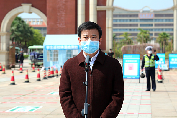 4月14日下午,学校在南门举行新冠肺炎疫情防控应急演练动员会。学校疫情防控领导小组全体成员参加。动员会由党委副书记陈湘如主持。