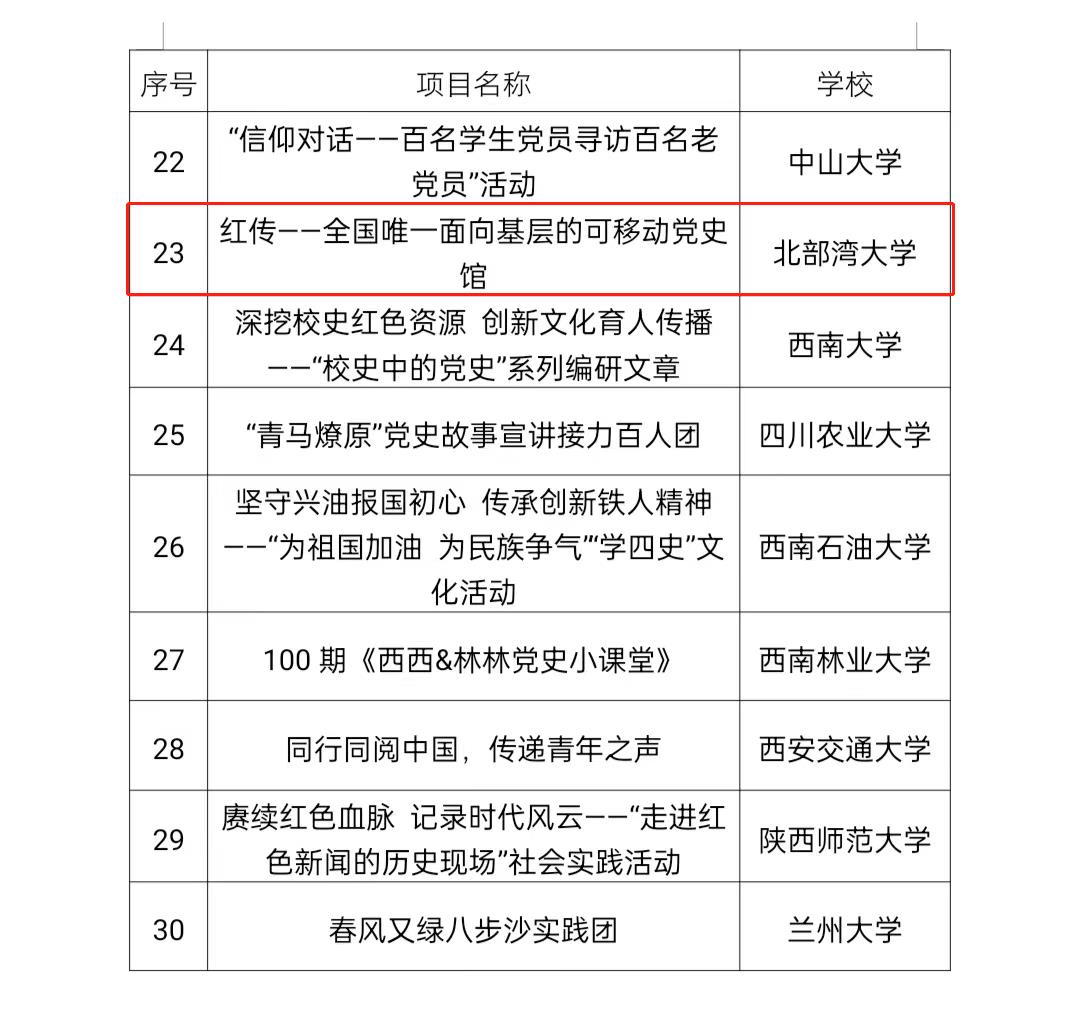 北部湾大学党委宣传部和创新创业学院联合申报的《红传——全国唯一面向基层的可移动党史馆》项目获评特色展示项目,全国仅30个,广西唯一一个项目获得该荣誉。