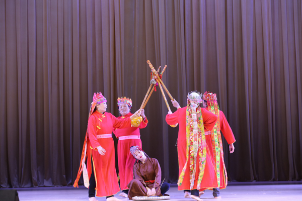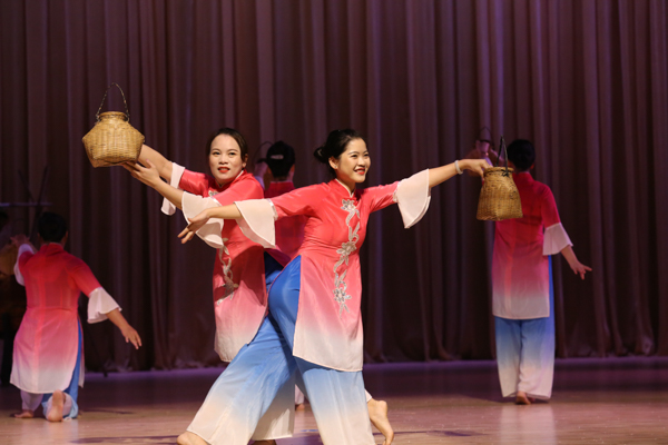 在学校礼堂举行的文化展演晚会上,情景舞蹈节目《开海了》,将渔民开海时的欣喜展现的一览无余,传统捕鱼工具高脚罾的出现更增添了真实感。壮族天琴及民歌表演《祈天》,蕴藏着壮族人民对大自然的感激,将观众也引入了神秘的壮族文化之境中。节目最后,陈锦山和表演者们共同唱响《我和我的祖国》,饱含爱国情意的歌声唱出了民族文化自信和自豪感,为此次文化展演成功落幕划上圆满的句号。
