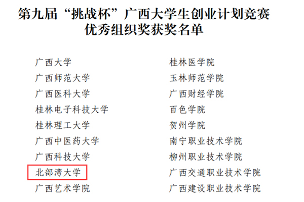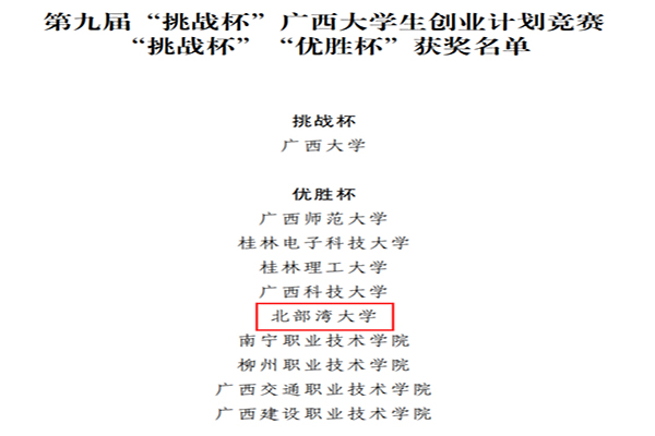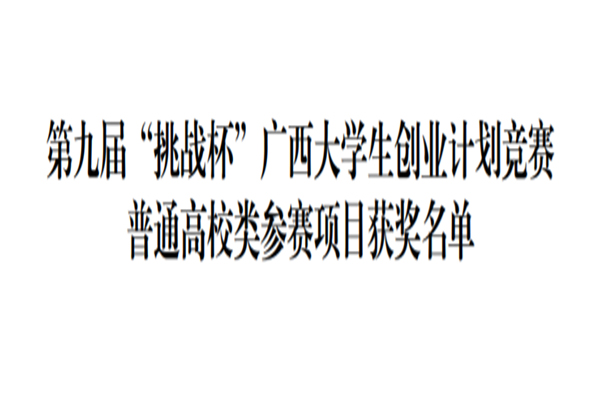 近日,第九届“挑战杯”广西大学生创业计划竞赛获奖名单公布,我校首次进入“优胜杯”获奖名单,同时获得优秀组织奖。在大赛中,我校22支参赛队伍全部获奖,其中金奖6项、银奖5项、铜奖11项,创历史最好成绩。