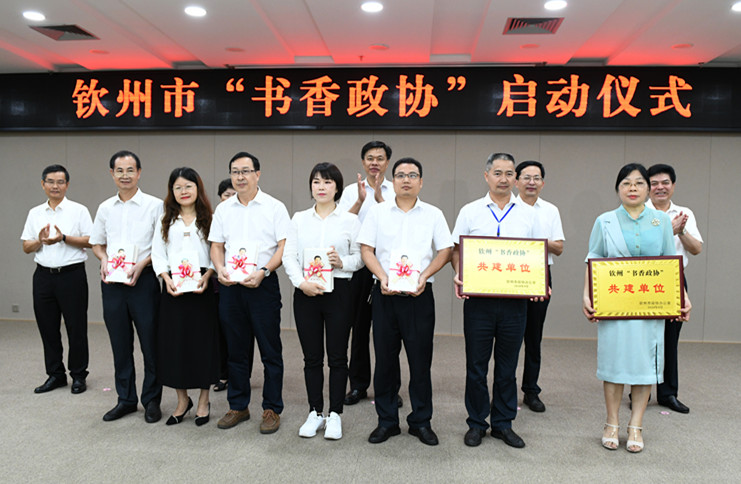 启动仪式上,陈锦山副书记与市委领导向政协委员代表赠书。市政协主席吕洪安、党组副书记陆明向我校图书馆、钦州市图书馆授予“钦州‘书香政协’共建单位”牌匾。