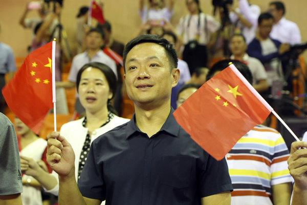 晚会最后,由我校代表队领唱《我和我的祖国》带动全场大合唱,将晚会气氛推向最高潮。(杨君兰 摄)