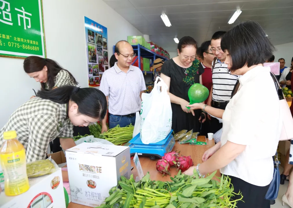 当天,满载脱贫希望的首个扶贫项目——北部湾大学扶贫超市在学校体育馆裙楼揭牌。从博白县运来的大批特色农副产品,吸引了学校大批师生前来购买。超市内人潮涌动。