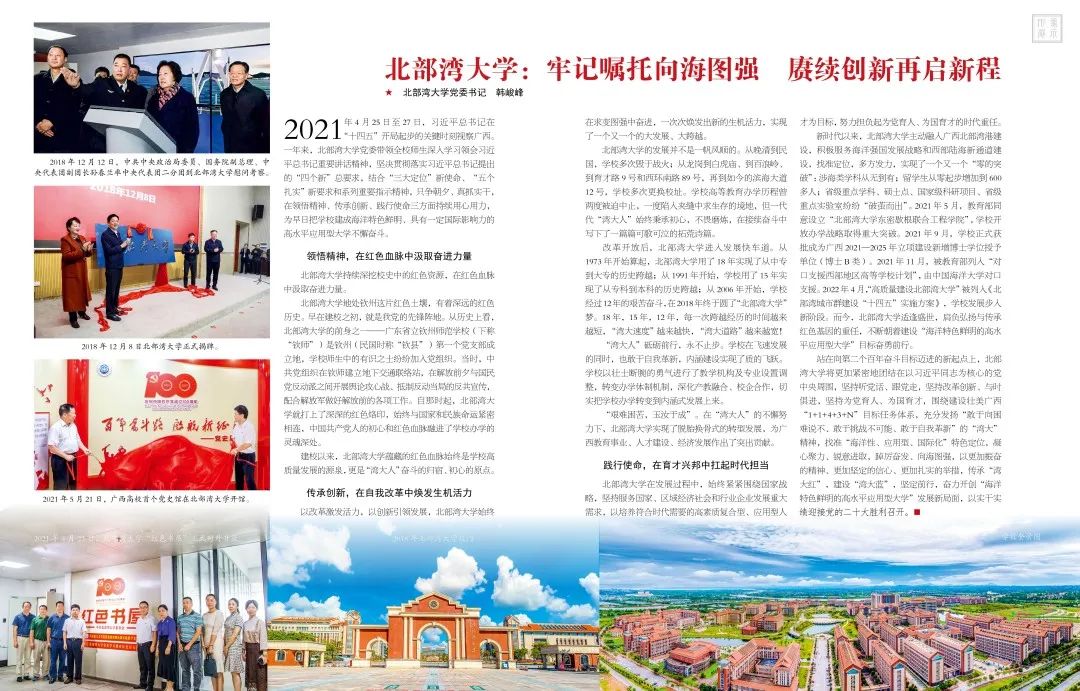 文章指出,站在向第二个百年奋斗目标迈进的新起点上,北部湾大学将更加紧密地团结在以习近平同志为核心的党中央周围,坚持听党话、跟党走,坚持改革创新、与时俱进,坚持为党育人、为国育才,围绕建设壮美广西“1+1+4+3+N”目标任务体系,找准“海洋性、应用型、国际化”特色定位,以更加振奋的精神、更加坚定的信心、更加扎实的举措,传承“湾大红”,建设“湾大蓝”,奋力开创“海洋特色鲜明的高水平应用型大学”发展新局面,以实干实绩迎接党的二十大胜利召开。