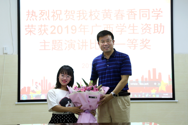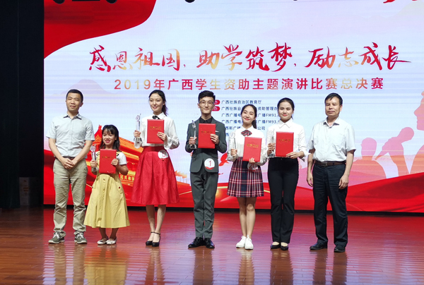 据悉,学校通过开展二级学院选拔赛及校级比赛,选送优秀选手参加并顺利入围自治区级总决赛。最终,在6月2日举行的2019年广西“感恩祖国 助学筑梦 励志成长”资助主题演讲比赛总决赛中,我校资源与环境学院黄春香同学从全区77所高校的选手中脱颖而出,以总得分第一名的优异成绩荣获一等奖。
