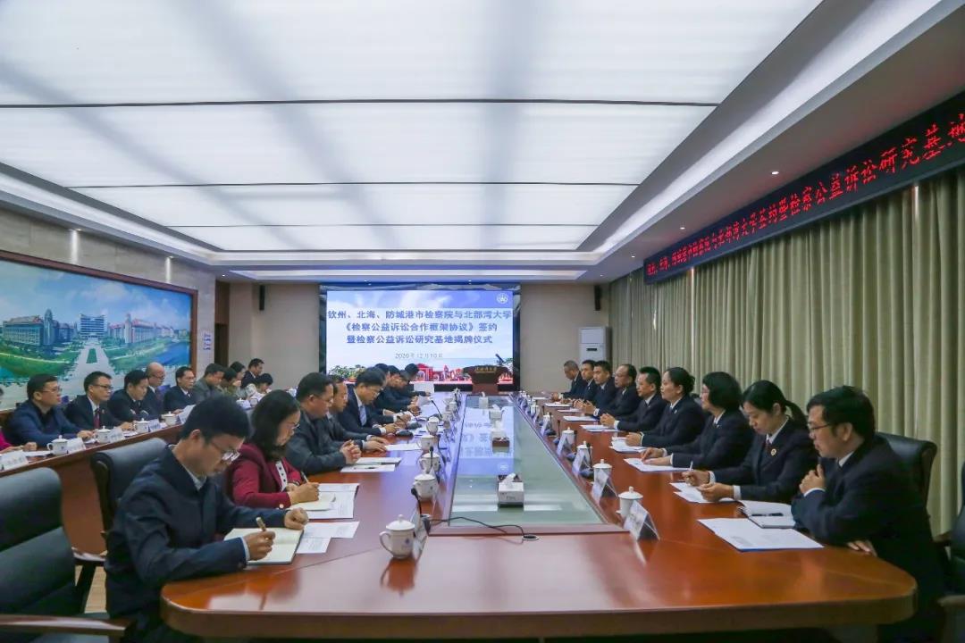 12月10日上午,钦州、北海、防城港三市检察院联合我校签订《检察公益诉讼合作框架协议》,在我校建立广西首个检察公益诉讼研究基地,并举行基地成立揭牌仪式。检察公益诉讼研究基地的成立,是钦州、北海、防城港三市检察机关继联合建立北部湾生态环境保护领域协作机制后的又一工作创新,同时也是检察机关助力推进北钦防一体化建设、深化检校合作的标志性成果。