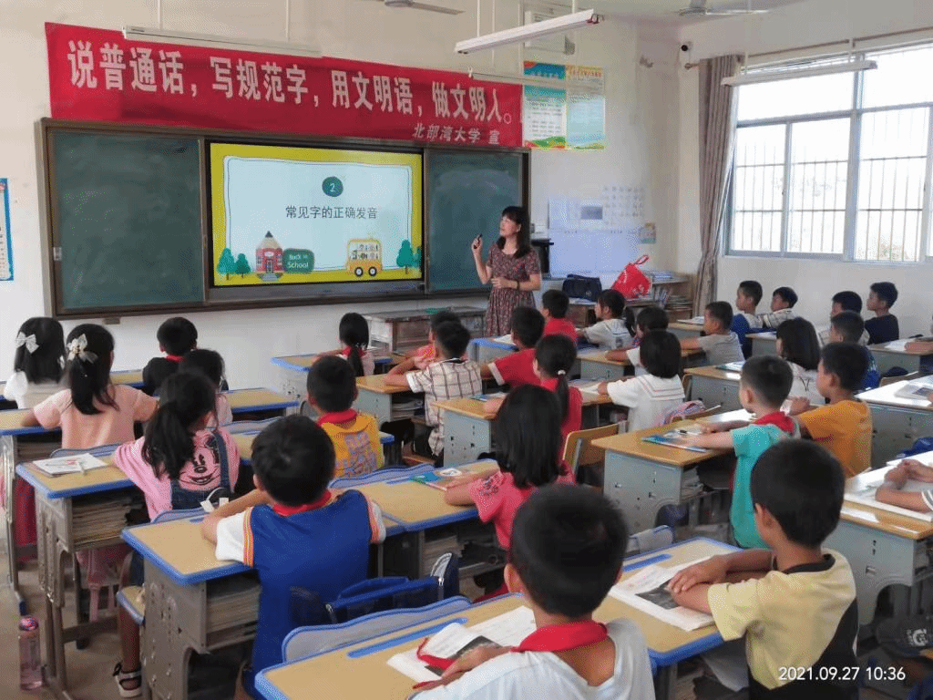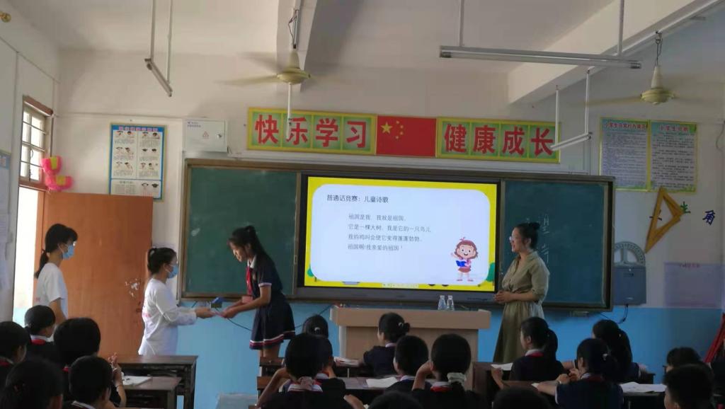 当天,在驻村第一书记的陪同下,我校推普小组分别前往周北村、英梅村、长新村、富门村、分新村、良荔村等6个小学开展“送教下乡“推普活动。测试员们为6所村小学的教师进行了一对一普通话辅导。测试员还携手普通话协会的同学们走进小学课堂,为孩子们上了一堂生动的普通话课。崭新的理念、精湛的教学艺术有效地把普通话的基本知识、常见字的正确发音、为什么要推广普通话、如何讲好普通话等知识进行了宣传推广,深受当地师生的好评。