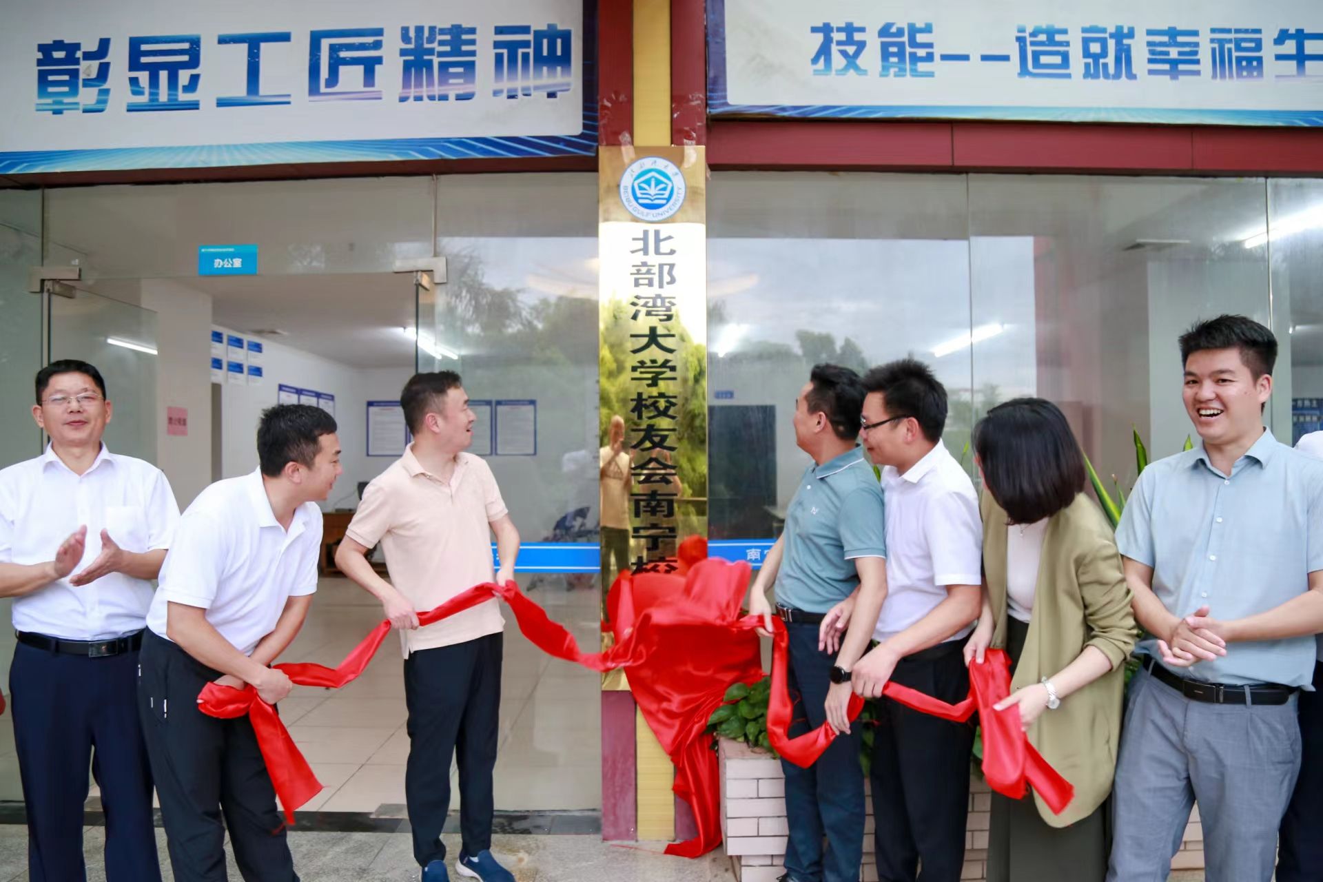 苗剑(左三)和徐志伟(右四)共同为北部湾大学校友会南宁校友之家揭牌