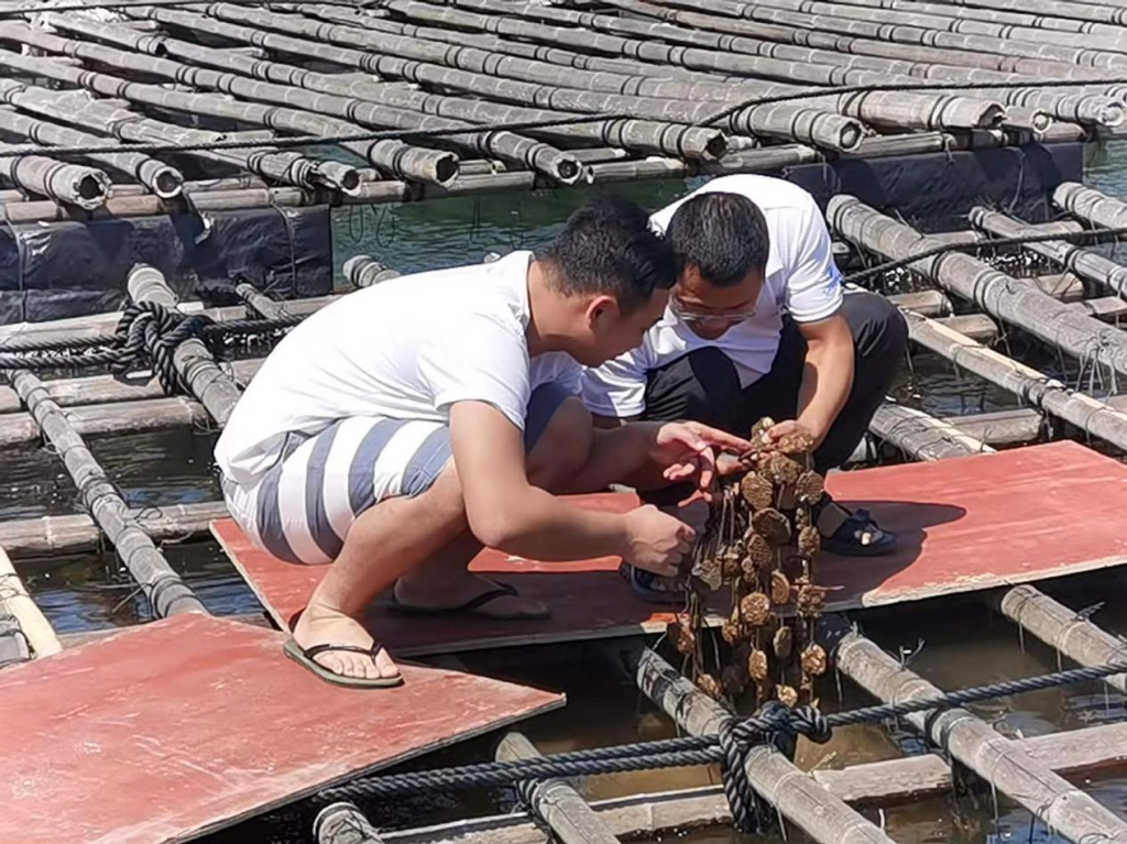 学校大蚝育肥团队成员查看养蚝户蚝苗生长情况