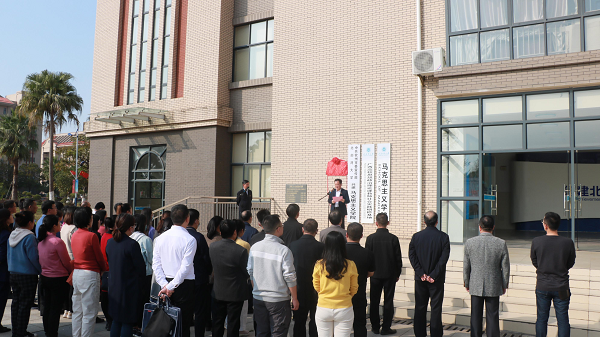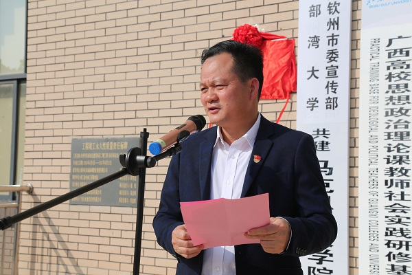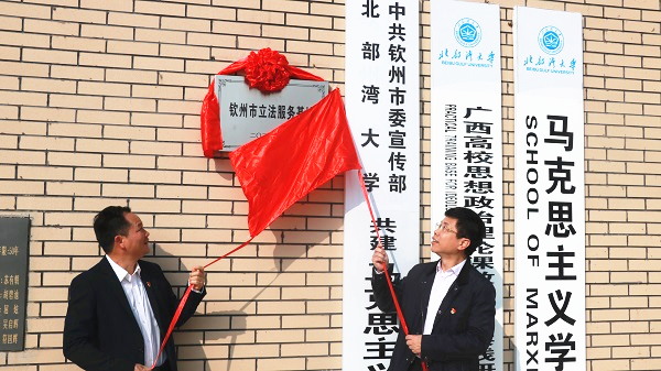 揭牌仪式在北部湾大学海洋馆、马克思主义学院一楼正门举行。覃天卫、韩峻峰一同为钦州市立法研究评估与咨询服务基地揭牌。钦州市人大常委会相关职能部门领导干部、学校相关部门、马克思主义学院负责人及学院全体教师共同见证了这一激动人心的时刻。