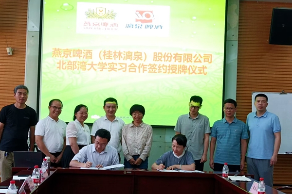 在燕京啤酒(桂林漓泉)股份有限公司,陈磊代表学校与燕京啤酒(桂林漓泉)股份有限公司签署教学实习协议,并为公司授予“北部湾大学实践教学基地”牌匾。