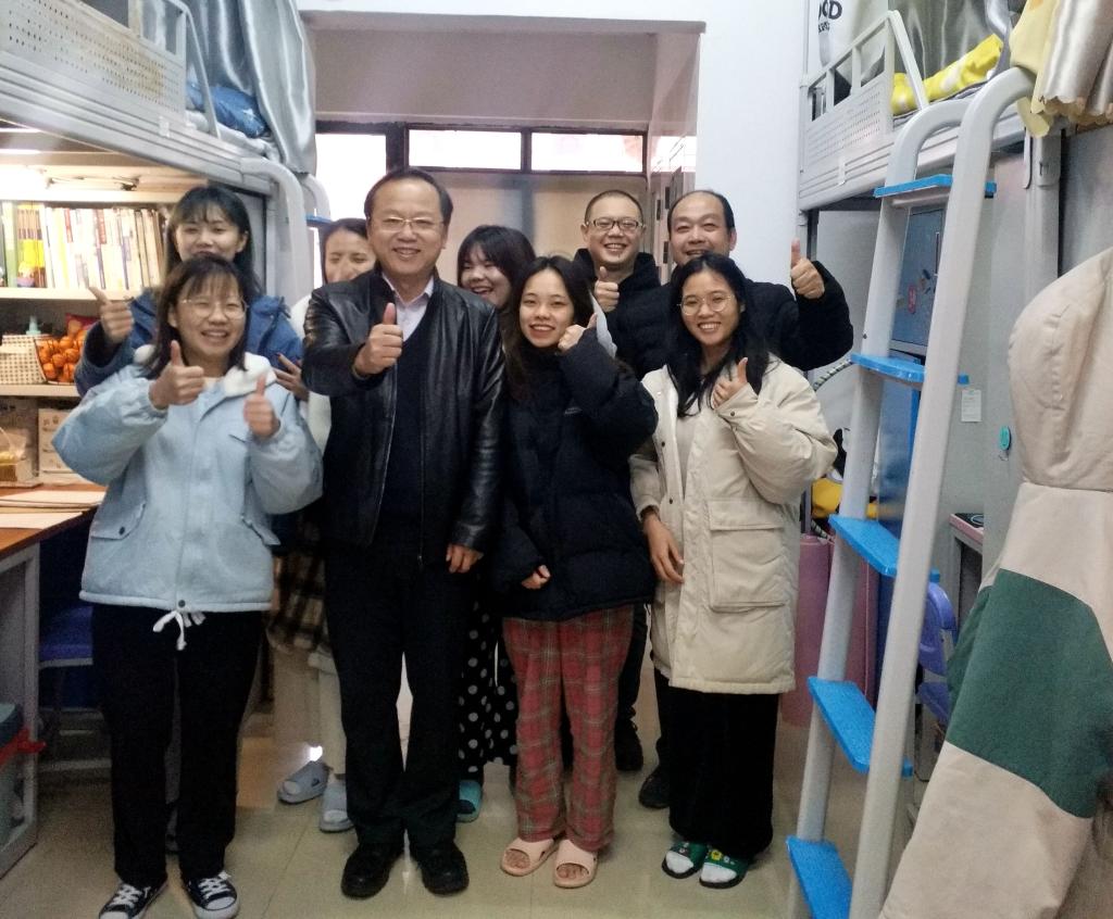 1月7日下午,黄鹄副校长来到水产本192班510女生宿舍。他向大家致以新年的问候和美好的祝福,并亲切地与同学们交流,了解她们的学习、生活和家里情况。黄鹄副校长再三叮嘱大家注意保暖,并鼓励大家认真复习,争取期末考出理想成绩。他表示,同学们遇到问题和困难,要及时反映,学校会尽大最大努力帮助大家解决。