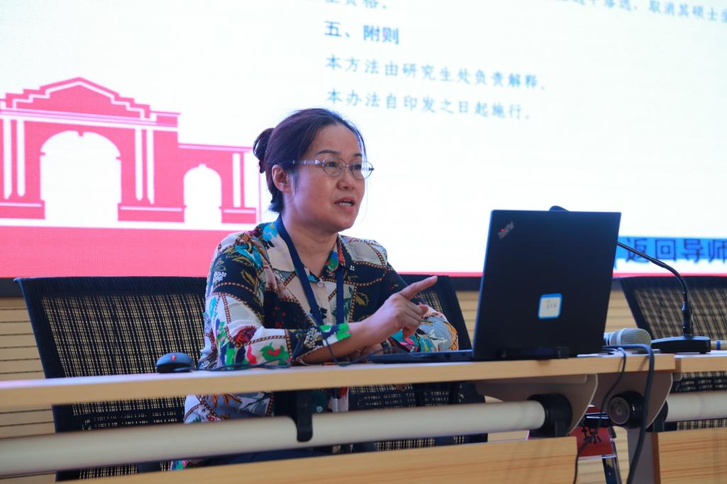随后,研究生处处长刘琼做《北部湾大学研究生教育管理制度学习》的专题培训。刘琼处长传达了全国研究生教育会议的精神,讲解了我校研究生教育管理制度中对于导师职责、导师角色定位、导师招生资格、以及研究生培养等方面的具体要求。