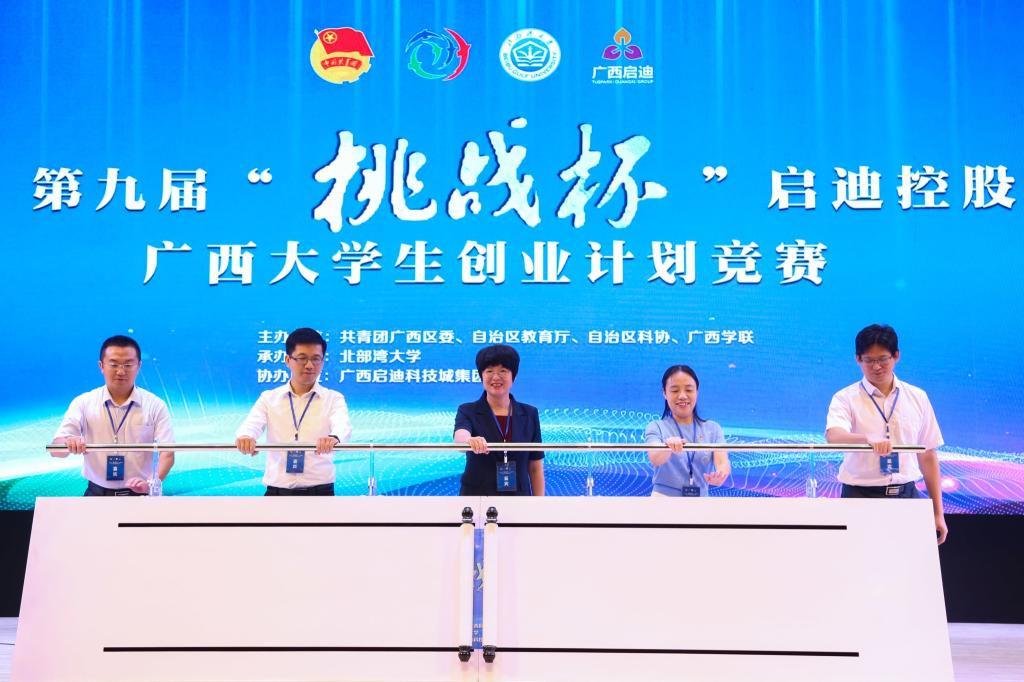 共青团广西区委副书记左向蕾 ,自治区科学技术协会党组成员、副主席梁春花,自治区党委教育工委宣传部副部长、教育厅思政处副处长、高校团工委副书记胡寿鹏,广西启迪科技城集团副总裁曾庆,北部湾大学党委常委、副校长陈磊出席开幕式并共同为大赛推杆启幕。