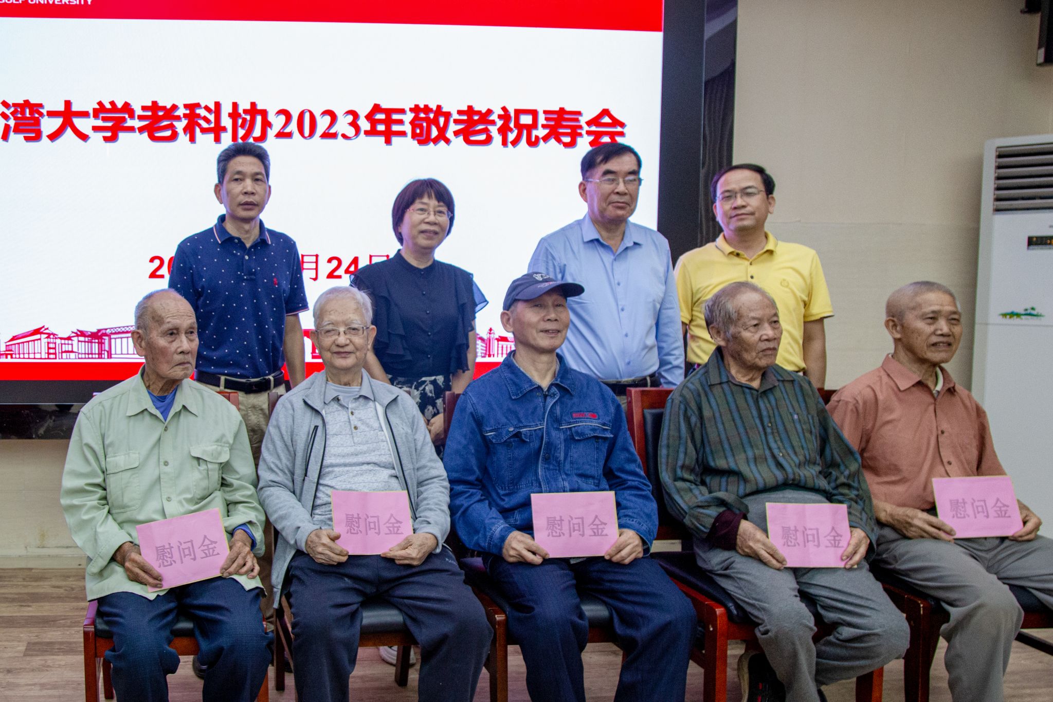 在老科协座谈交流会上,陆衡副校长(后排左2)为老科协代表送上慰问金并合影