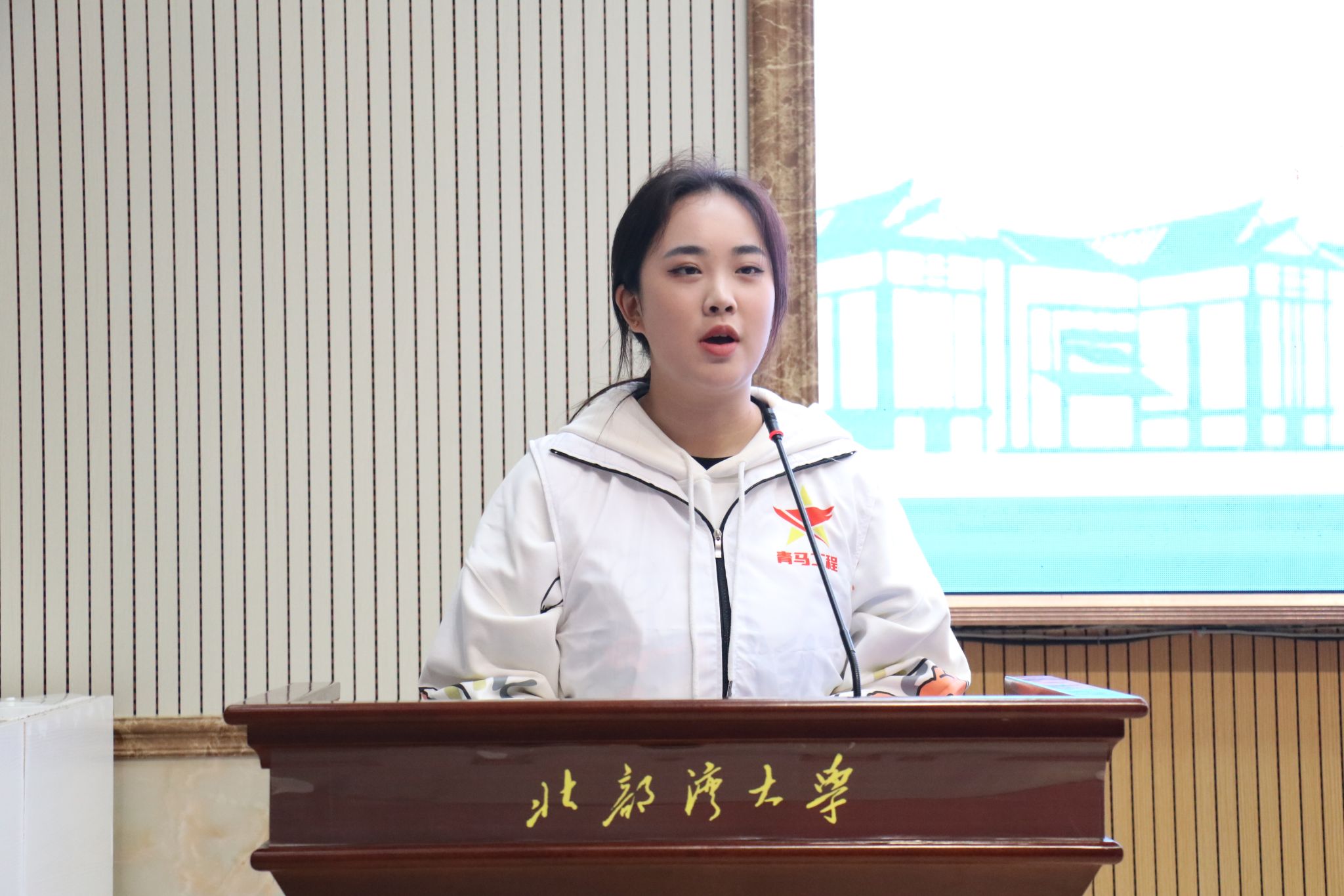 陶瓷与设计学院的尚紫晗同学代表全体青马学员发言。她表示将发挥榜样作用,提高政治站位,珍惜学习机会,在学习和生活中有所作为。随后,她作为领誓人带领全体学员们庄严宣誓。