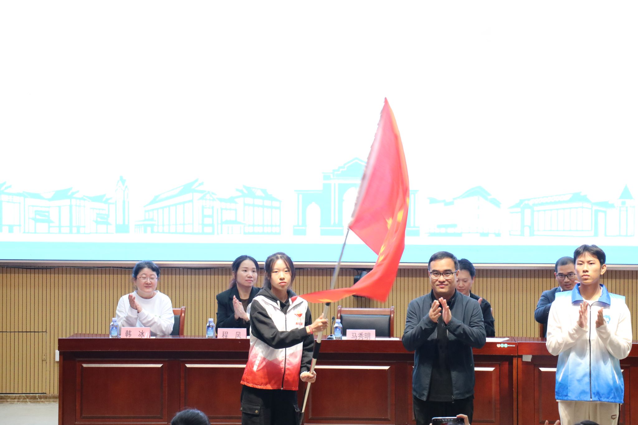 开班仪式上,马秀明为学员代表授旗,标志着学校“青马工程”培训班为期一年的培养工程正式启动。