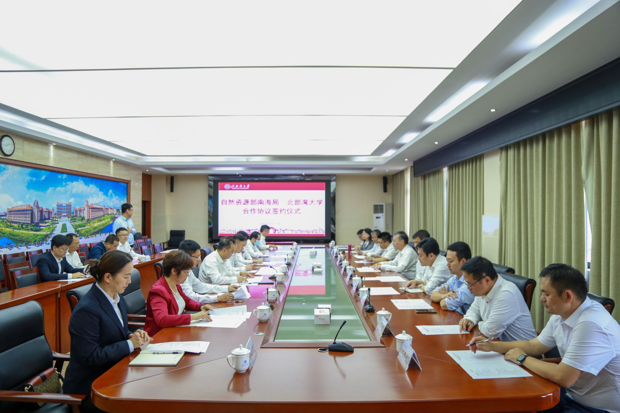 雷波局长与苗剑校长代表双方一同签订《自然资源部南海局 北部湾大学合作框架协议》,并在签约完成后共同为北部湾海洋生态系统保护与修复实验室揭牌。(韦文翰 周晟旻 摄)