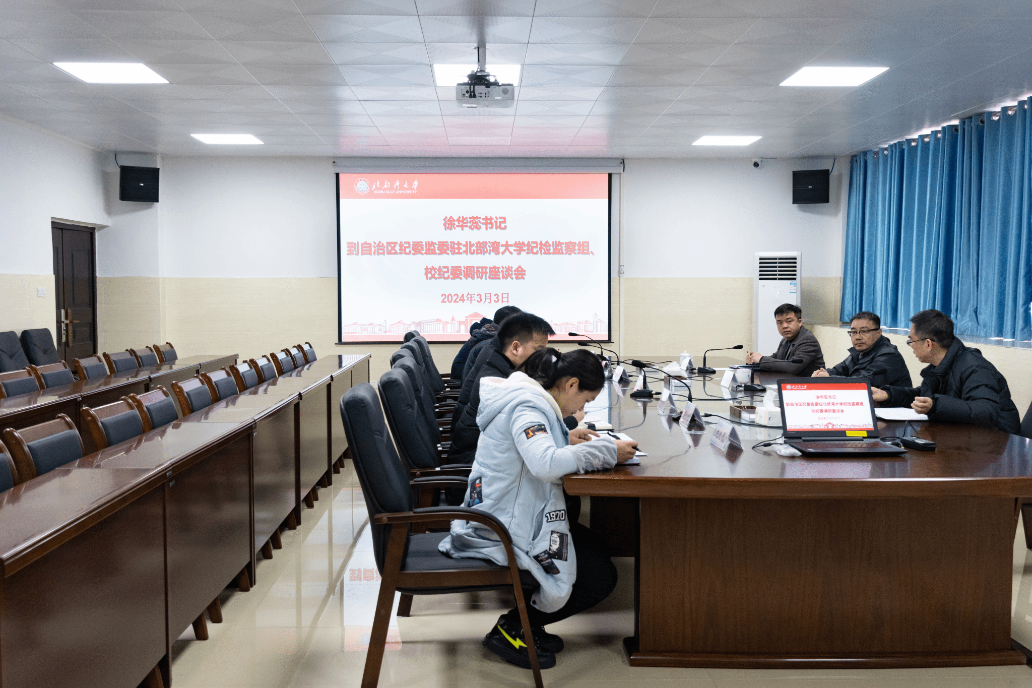 3月3日上午,学校党委书记徐华蕊到自治区纪委监委驻北部湾大学纪检监察组、校纪委调研,自治区纪委监委驻校纪检监察组组长、学校纪委书记谢立平陪同调研。