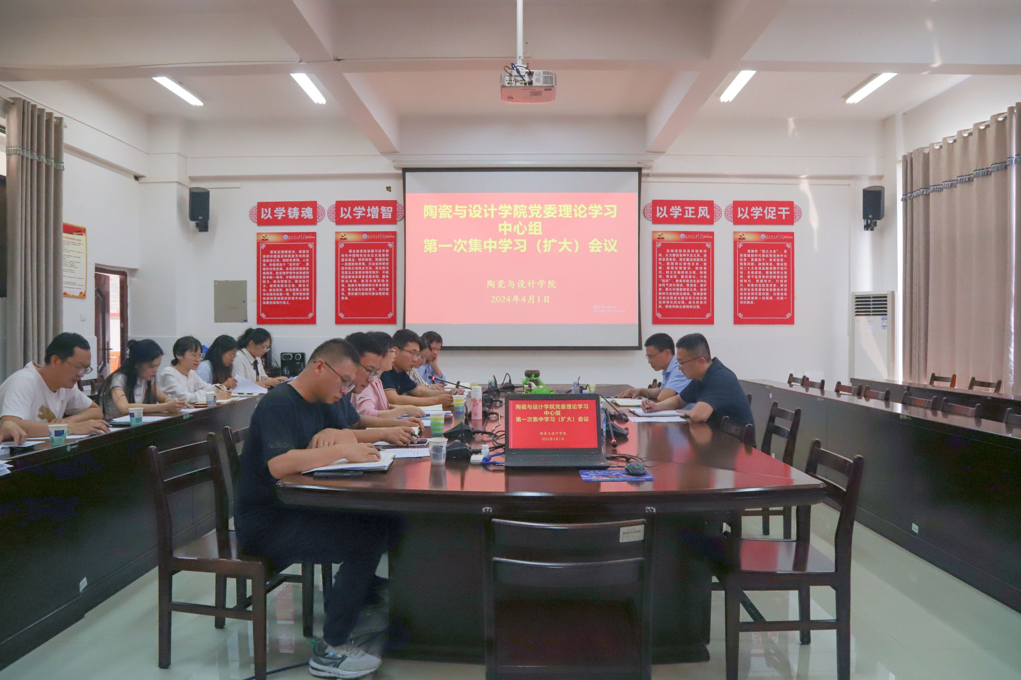 4月1日下午,校党委副书记陈磊到陶瓷与设计学院巡听旁听学院党委理论学习中心组学习(扩大)会议并就宣传、学生、团委工作进行调研。学院党委理论学习中心组成员、辅导员、教师代表参加理论学习。