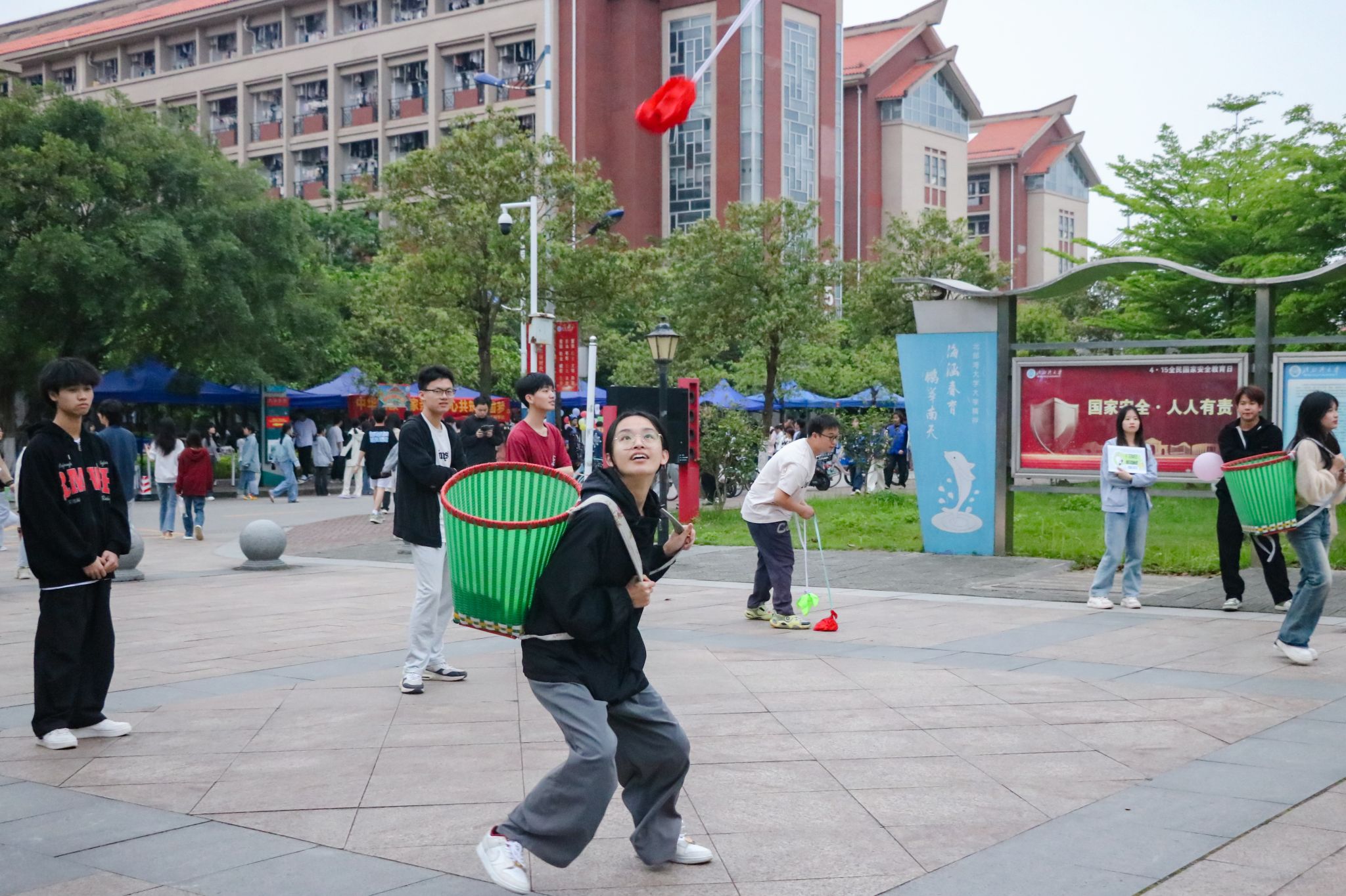 在游园会的现场,来自各个学院的学生身穿民族服饰,热情地邀请师生体验抛绣球、竹竿舞、走板鞋、踢毽球等广西民俗文化活动,品尝五色糯米饭、艾叶糍粑等广西特色美食,亲手制作手工绣球、钦州坭兴陶等广西特色手工制品,参与投壶、拔河、知识问答等有奖活动,不少过往师生被丰富多彩的民俗文化活动所吸引,纷纷参与其中,现场氛围欢快热烈。