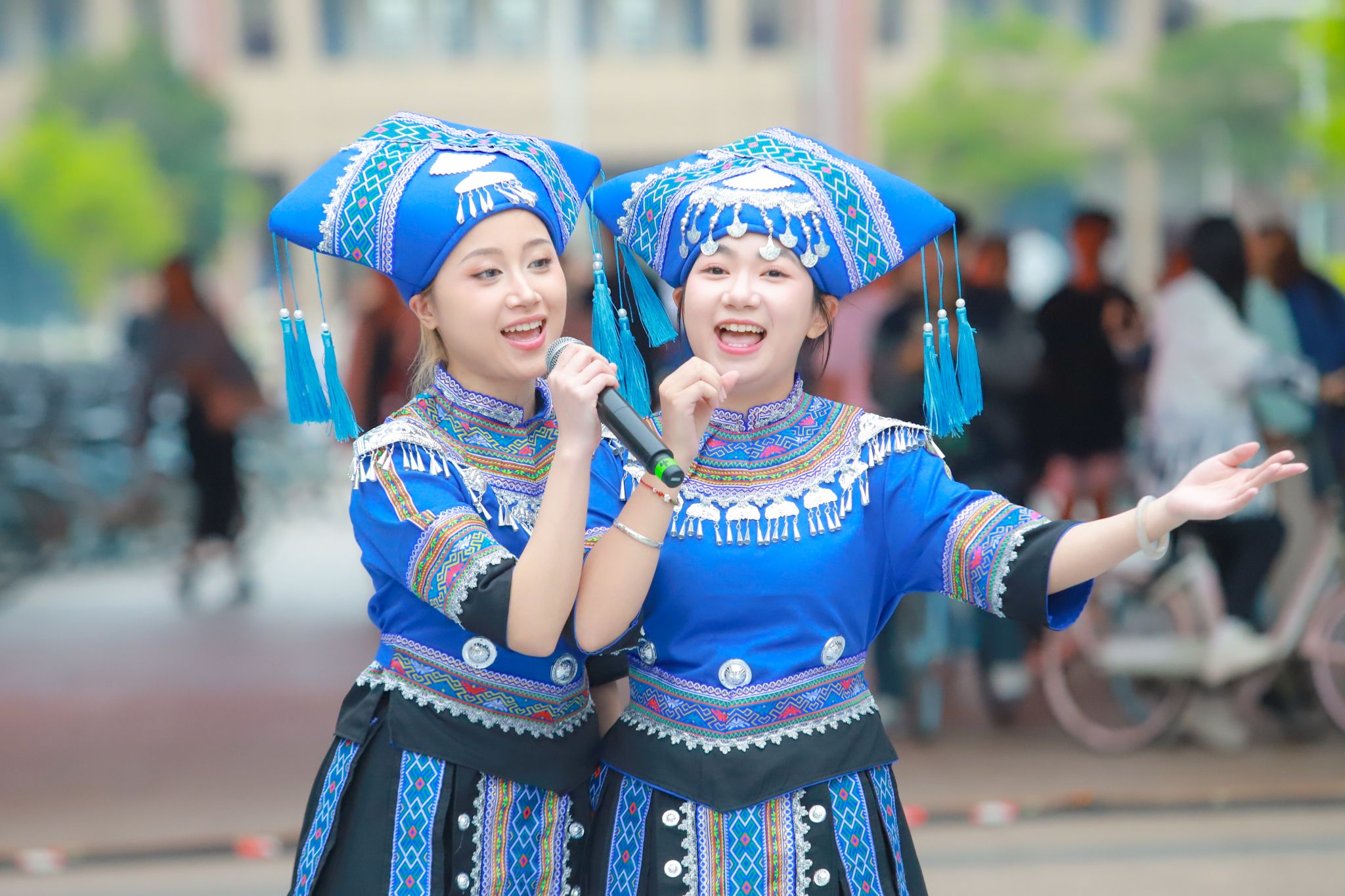 在民俗文艺演出区域,随着《大地飞歌》的乐声奏响,壮乡民族服饰走秀为演出拉开了序幕,《山歌好比春江水》《走在山水间》《壮族敬酒歌》等民俗歌曲及舞蹈接连上演,为师生呈现了一场视听盛宴。演出渐入尾声,在场的演员和观众一同走到场地中央,共同跳起竹竿舞,将现场气氛推向高潮。闻讯前来观看的师生纷纷表示,“没想到能在自己学校里看到现场的唱山歌表演”“不仅能在一旁观看,还能加入其中,太有意思了”“从未像今天能近距离地感受广西三月三的节日氛围”。