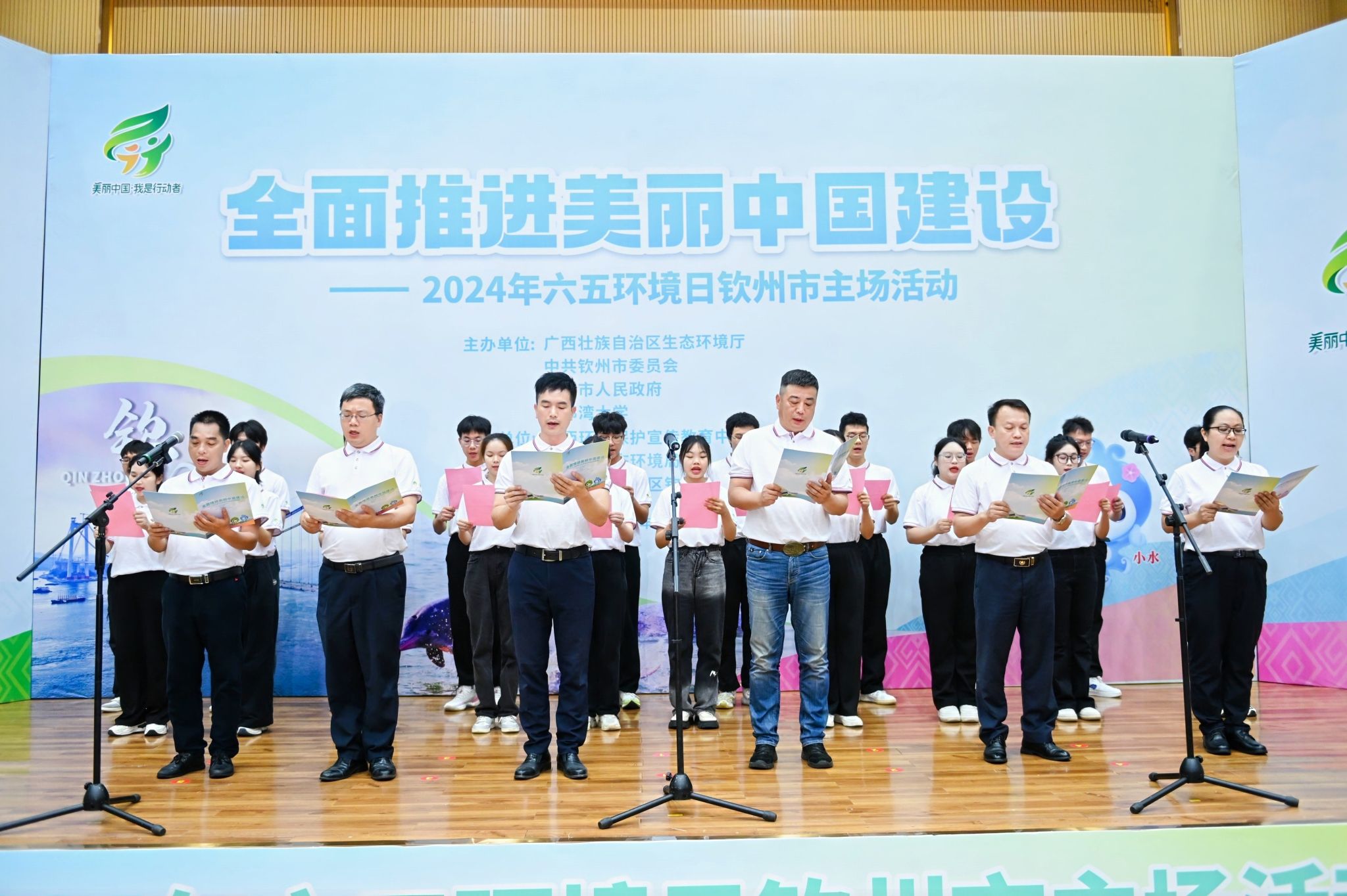 启动仪式上,首届自治区环境保护与生态文明建设先进集体和先进个人携手学生志愿者一起宣读了环保倡议宣言。钟畅姿、徐华蕊和市委常委、秘书长曾智,副市长徐科峰,校党委常委、副校长陈丹共同按下2024年六五环境日钦州市主场活动启动键。
