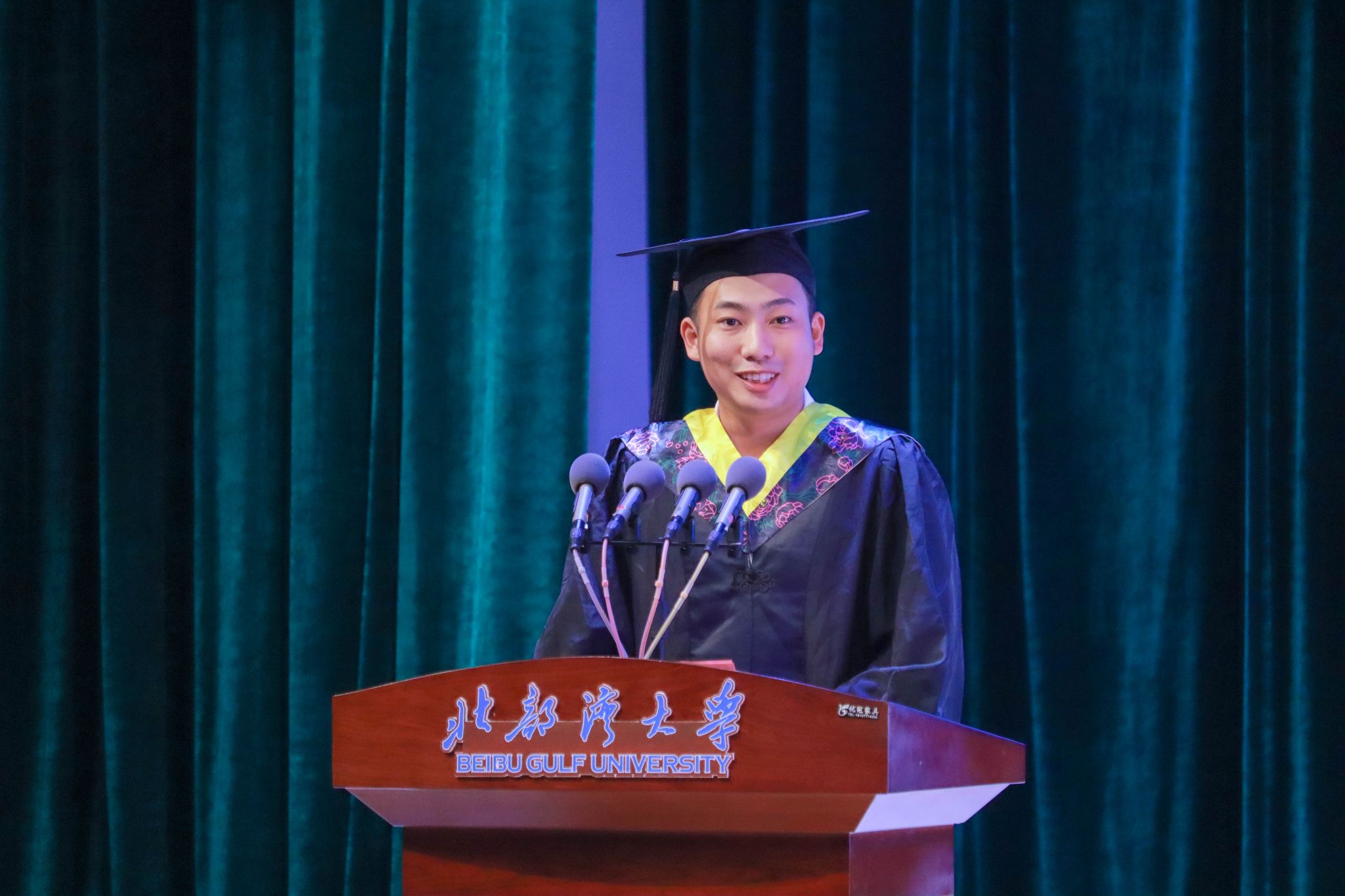 毕业生本科生代表姚志宏回忆了过去四年与湾大共同成长的时光,他表示会秉持“博观内省、达道知行”的校训争做有理想、敢担当、能吃苦、肯奋斗的新时代青年,用所学所思奋力书写中国式现代化的青春篇章。