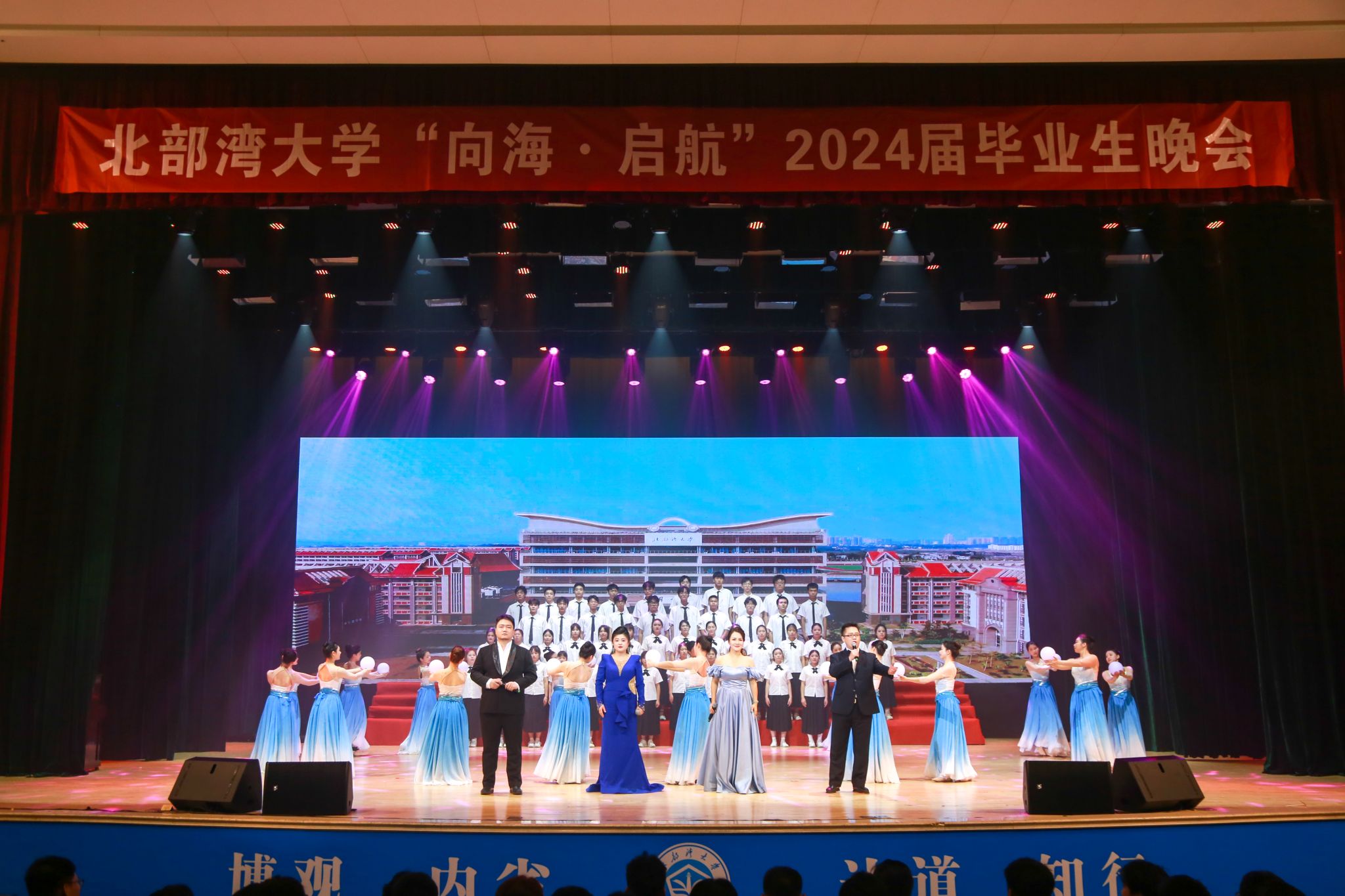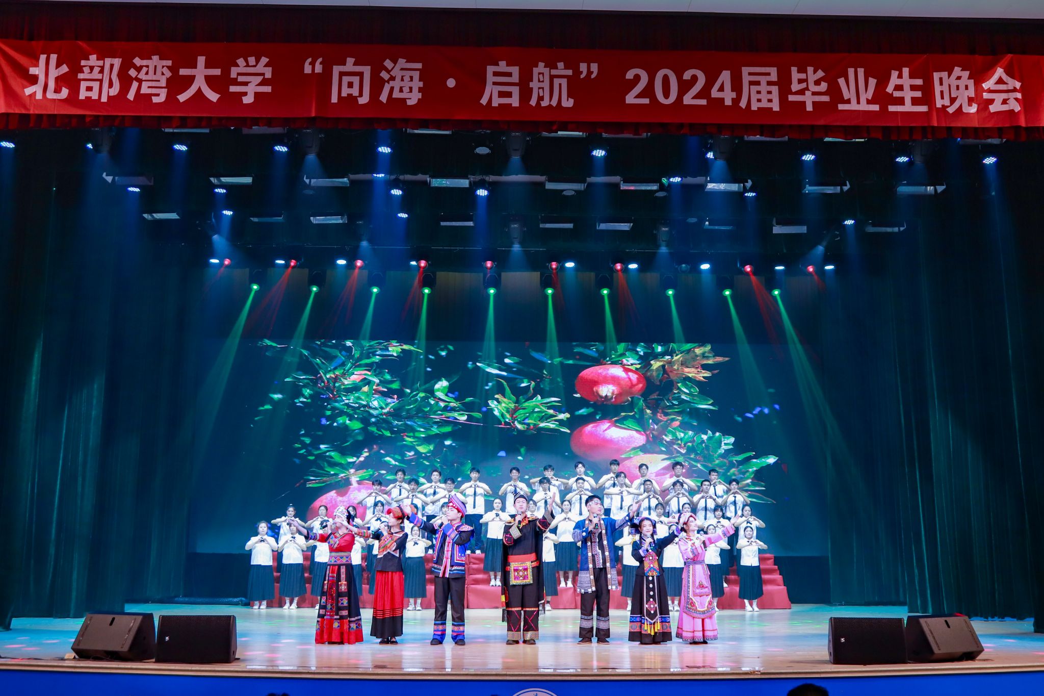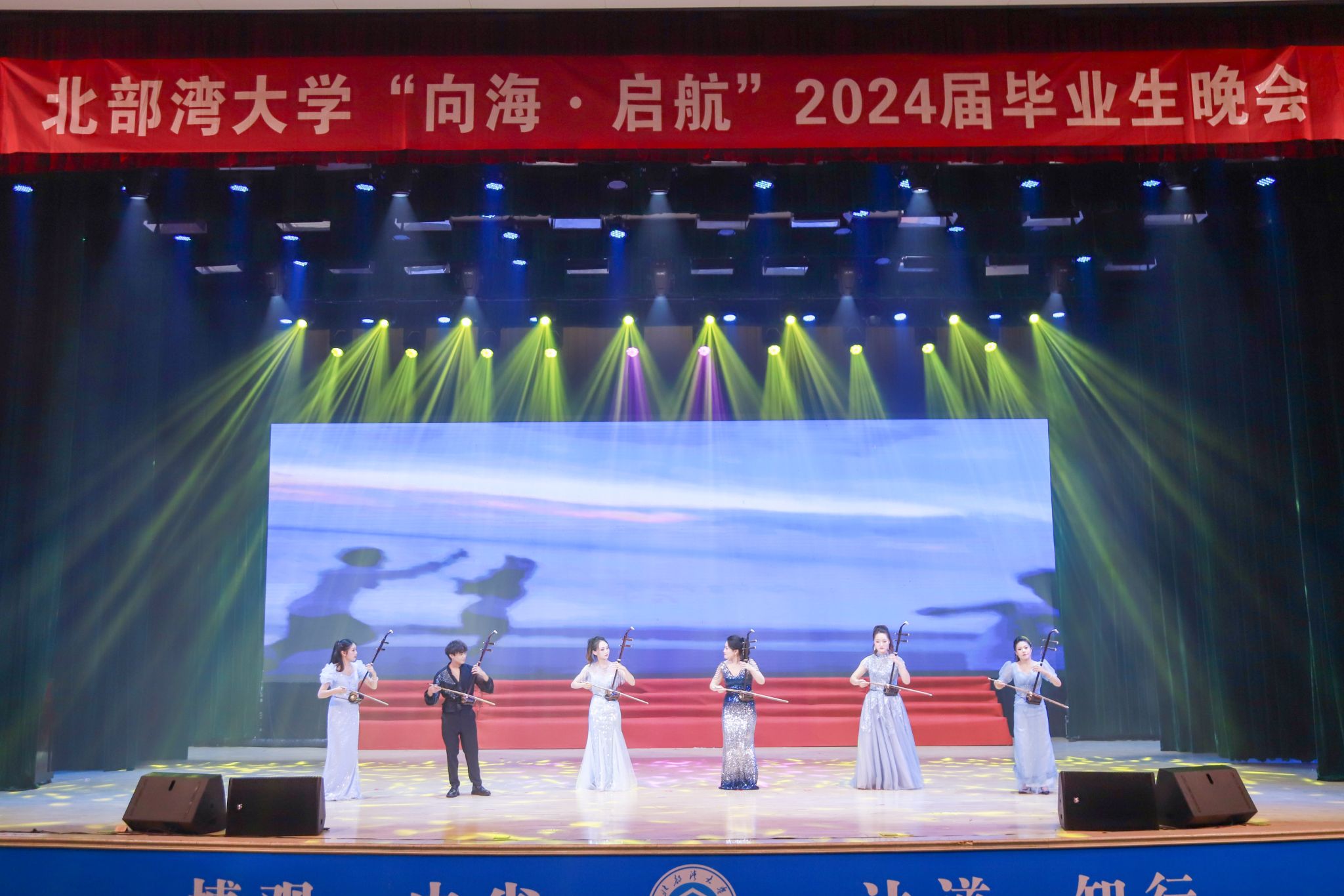 6月25日晚,北部湾大学“向海·启航”2024届毕业生晚会在学校礼堂隆重举行。学校党委书记徐华蕊,校党委副书记唐高华、陈磊,校党委常委、副校长陆衡、马秀明、陈丹与广西华谊能源化工有限公司、中交天津航道局有限公司平陆运河项目部、长江航道局平陆运河项目部等校外嘉宾、1500余名毕业生及家长代表观看了晚会。