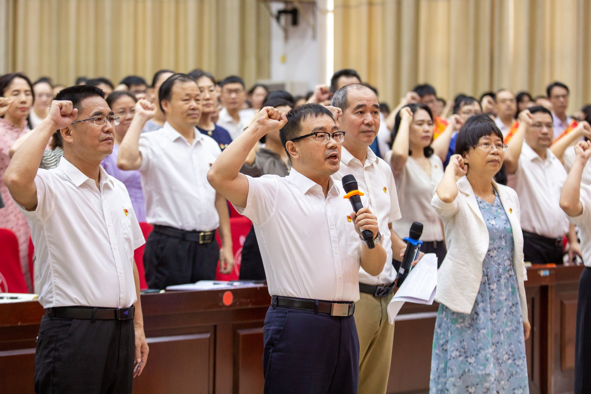 会场主席台背景墙上党徽闪耀,随着庄严雄壮的国歌声响起,大会正式开幕。会上,唐高华宣读了表彰文件。在家学校党委常委依次为受表彰的集体和个人颁发了荣誉证书,“光荣在党50年”老党员同志为新党员代表佩戴党员徽章,勉励每一位新党员要牢记党的教诲,弘扬党光荣传统,在实现中国式现代化新征程上展现青春新作为。