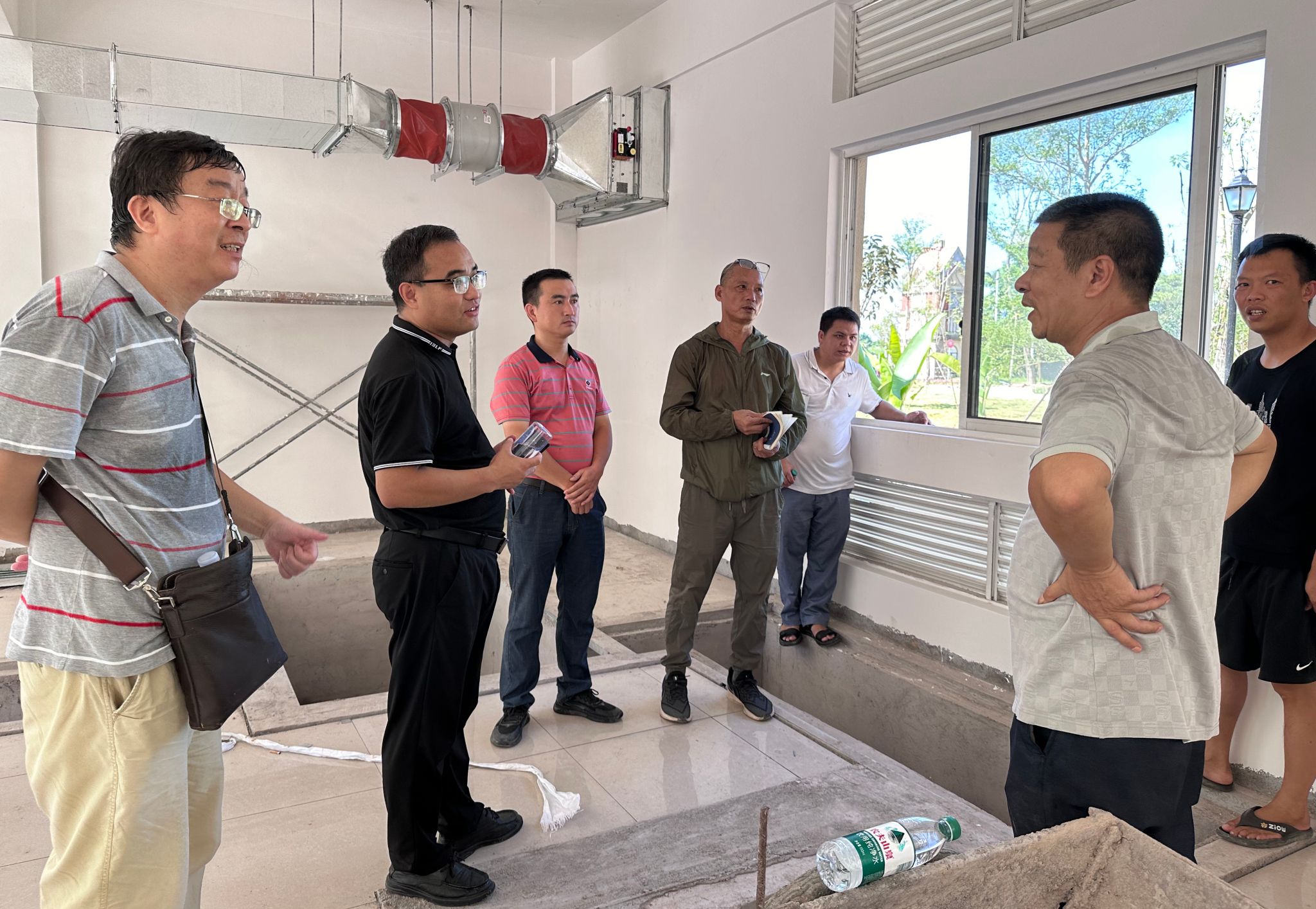 马秀明(左二)在学校西区工地检查相关工作
