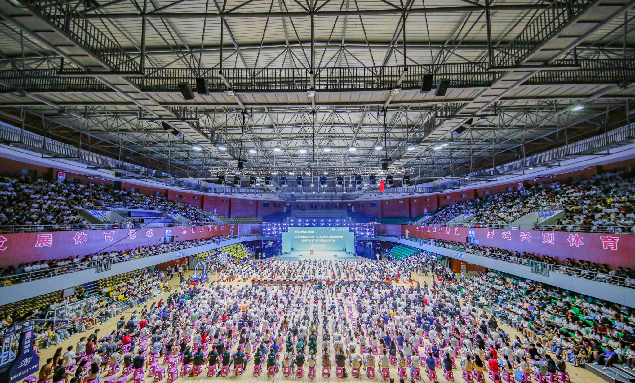 9月28日,校党委书记徐华蕊以“心怀鸿鹄之志,弘扬湾大精神特质,在新时代书写绚丽青春”为题,在体育馆为2024级新生讲授“思政第一课”。校党委副书记陈磊主持。全体在家校领导,各部门、各学院相关负责人,2024级新生辅导员同上一堂课。
