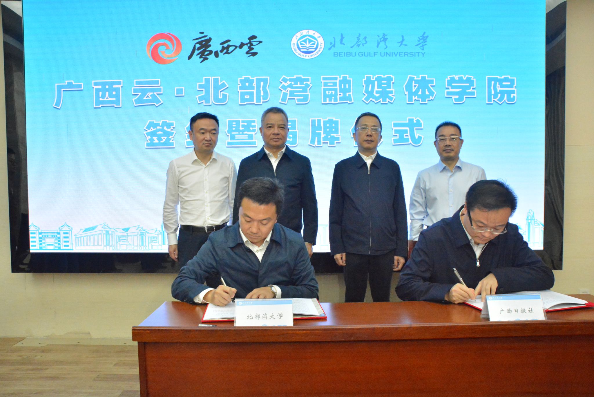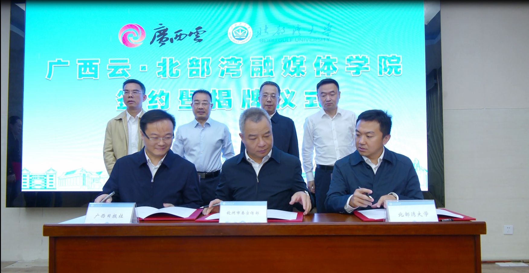 曾智、陈磊、阳天分别代表钦州市委宣传部、北部湾大学、广西日报社签署了共建广西云·北部湾融媒体学院战略框架合作协议。陈磊、阳天分别代表北部湾大学、广西日报社签署了双方战略合作框架协议。