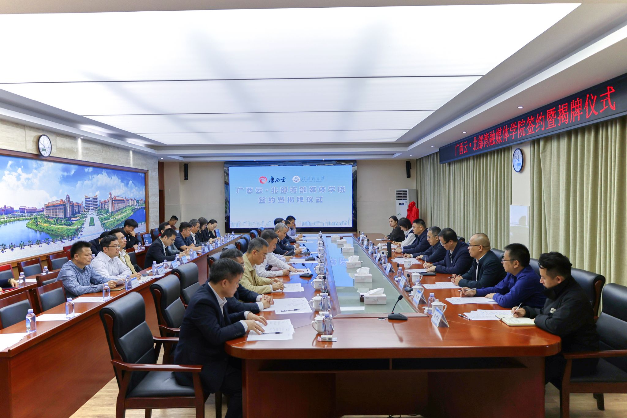 10月29日上午,由中共钦州市委员会宣传部、北部湾大学、广西日报社共建的桂南地区首个融媒体学院,广西云·北部湾融媒体学院在学校揭牌成立。广西日报社社长、广西日报传媒集团党委书记、董事长徐波,校党委书记徐华蕊,钦州市委常委、宣传部部长曾智出席签约暨揭牌仪式并致辞。校党委副书记、校长苗剑主持仪式。广西日报社副总编辑阳天,校党委副书记陈磊,自治区纪委监委驻北部湾大学纪检监察组组长、校党委常委、纪委书记谢立平出席仪式。
