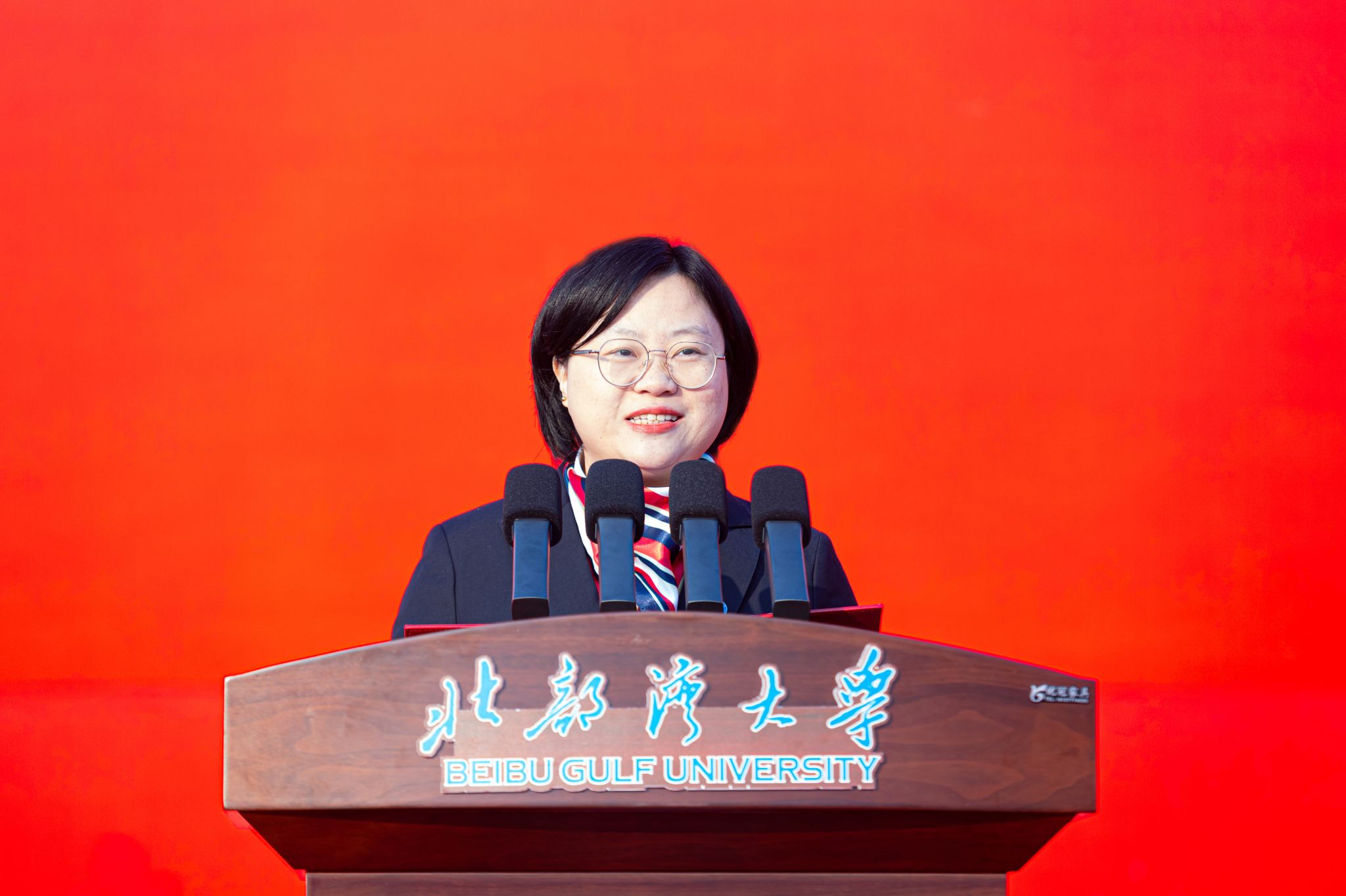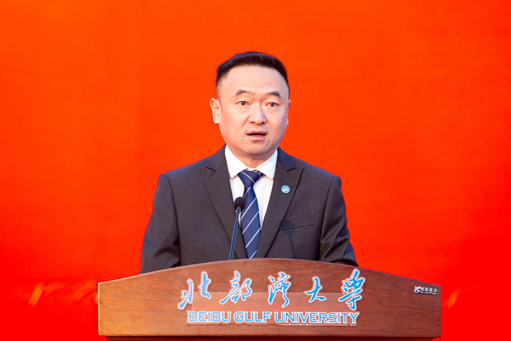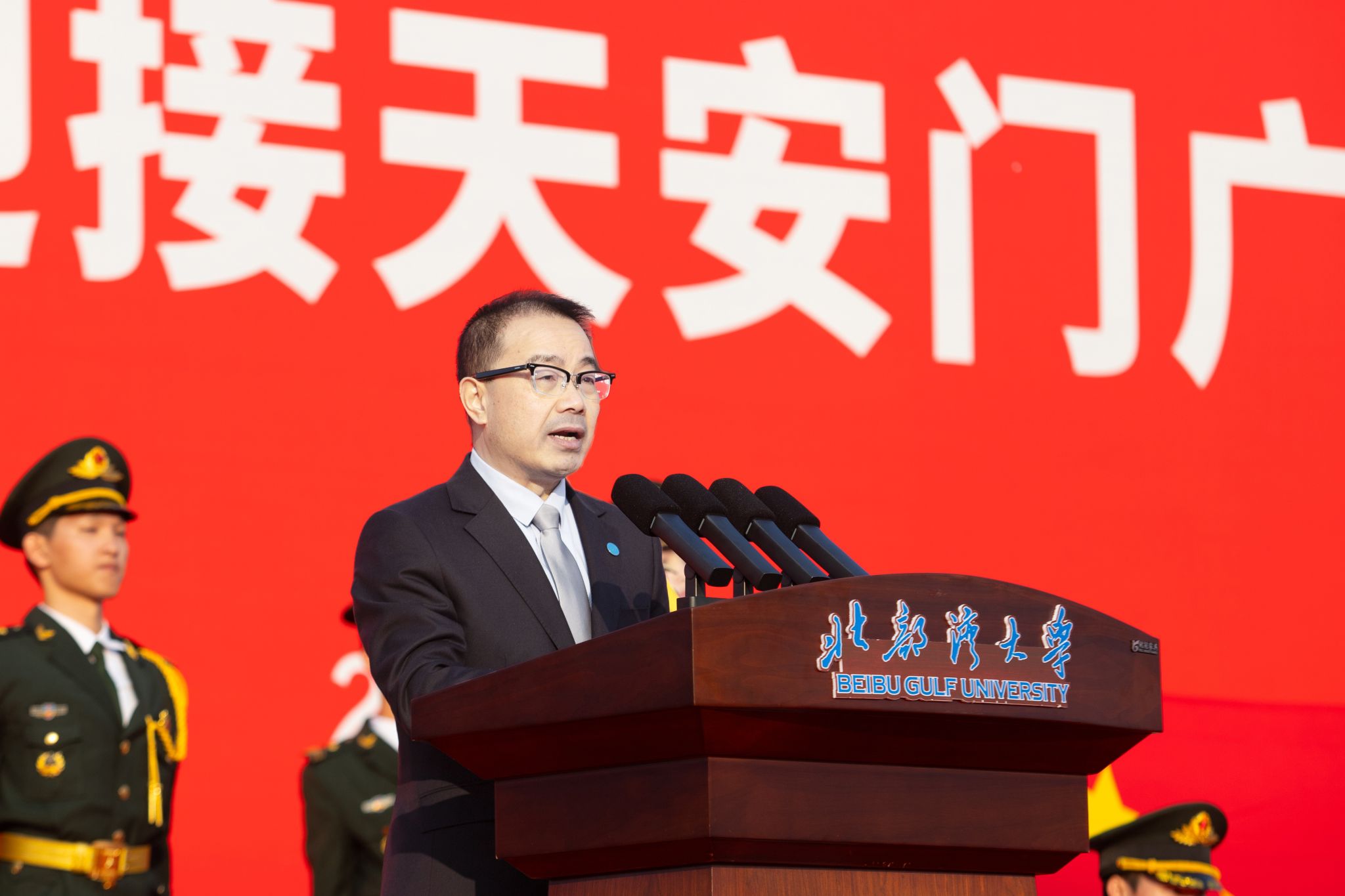 在鲜艳的五星红旗下,徐华蕊书记为我们带来了一堂内涵丰富、意义深刻的思政课。他追溯了中华民族百年屈辱与不屈抗争史,深情讲述了新中国诞生波澜壮阔的艰辛历程,着重强调了五星红旗在民族独立、国家富强和伟大复兴道路上所承载的重大意义。他勉励同学们要铭记历史,珍惜当下美好的生活,传承并弘扬先辈们的革命精神,以勤奋学习为祖国的繁荣富强添砖加瓦。他特别指出,这面曾在天安门广场升起的五星红旗,不仅承载着国旗法的庄严使命,更是我们心中对国旗敬重、对国家热爱的象征。他要求广大师生深刻领会国旗法的精神实质,以敬畏之心自觉遵守相关规定,用实际行动维护国旗的尊严,让五星红旗永远飘扬在我们心中,成为爱国情怀的永恒象征。他满怀深情地提到,这面在学校50周年校庆日于天安门广场升起的五星红旗,见证着学校发展与祖国支持、众人努力的紧密交织。他带领师生们回顾了学校50年栉风沐雨、砥砺奋进的发展历程,并与师生共勉,要带着这份来自祖国心脏的无上荣耀,勇担责任与使命,在未来的征程中继续砥砺前行、勇攀高峰,共同书写北部湾大学更加辉煌的篇章。他希望同学们树立远大理想,深刻认识到自身的责任与担当,将个人发展与国家需求紧密结合起来,在知识学习、科技创新、文化传承、社会建设领域,笃行奋进、挺膺担当,为以中国式现代化全面推进中华民族伟大复兴贡献青春智慧和力量。他希望老师们坚守立德树人的初心,牢记为党育人、为国育才的使命,严格遵守教师职业道德规范,充分发挥言传身教的作用,要牢记学校“海洋性、应用型、国际化”的办学特色,践行学生中心、成果导向、持续改进的办学理念,不断创新教学方法,提高教学质量,把爱国主义教育融入每一堂课,激发学生的爱国热情和创新精神,培养出更多德智体美劳全面发展的社会主义建设者和接班人,为祖国的繁荣昌盛贡献北部湾大学的力量。