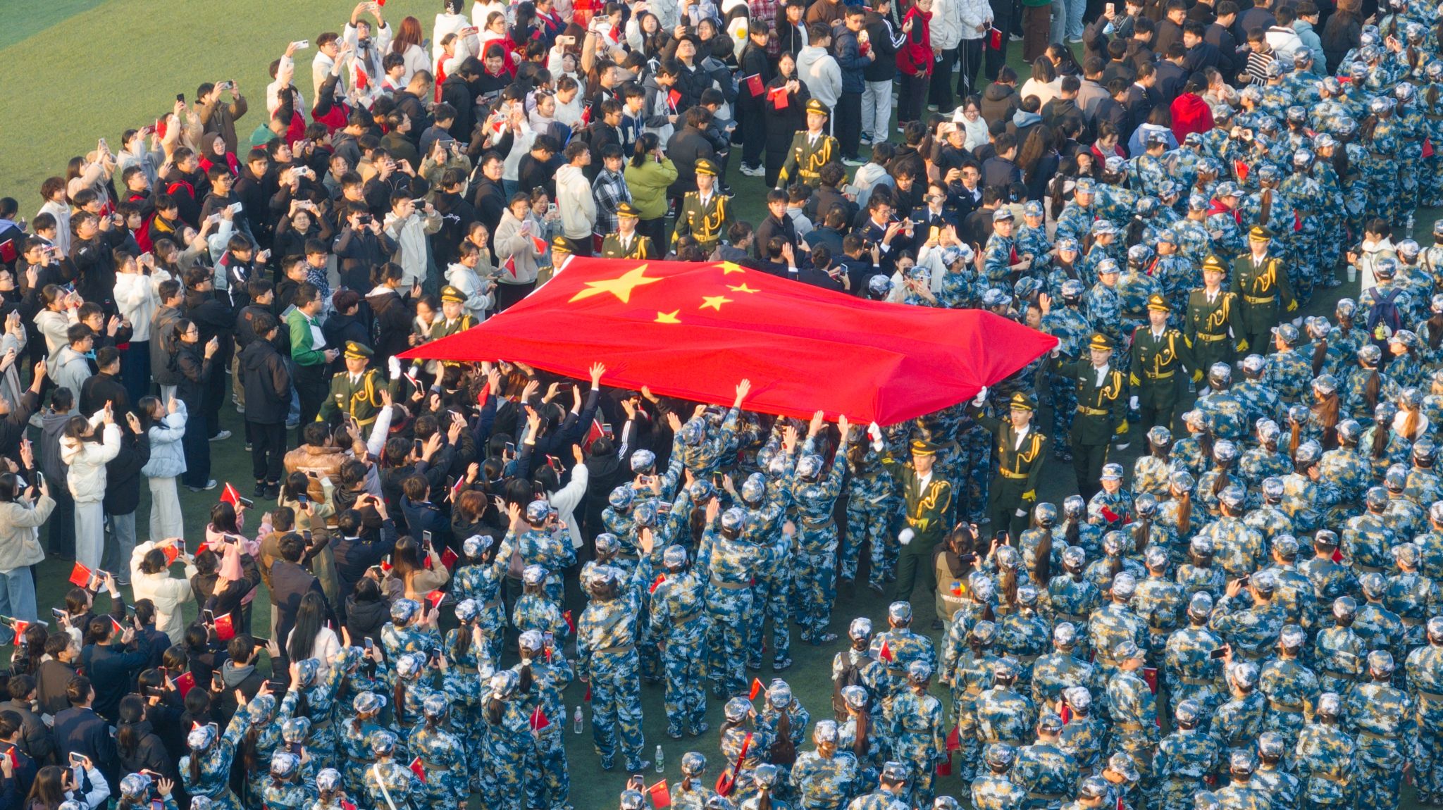 从北京到钦州,这一面来自天安门广场的国旗,跨越近2500公里,在2025年的第一天亮相北部湾大学。在迎接天安门广场国旗仪式上,学校国旗护卫队迈着整齐步伐走上主席台。学校党委书记徐华蕊将国旗和证书交接给学校国旗护卫队成员。国旗护卫队员将这面长5米、高3.3米的国旗徐徐展开,绕场展示。鲜艳的五星红旗从所有队列的上方经过,如祖国母亲温柔的轻抚。全体师生和各界代表满怀深情凝望国旗,伸手轻轻触摸,拳拳爱国心炽热如火,浓浓爱国情萦绕满场。