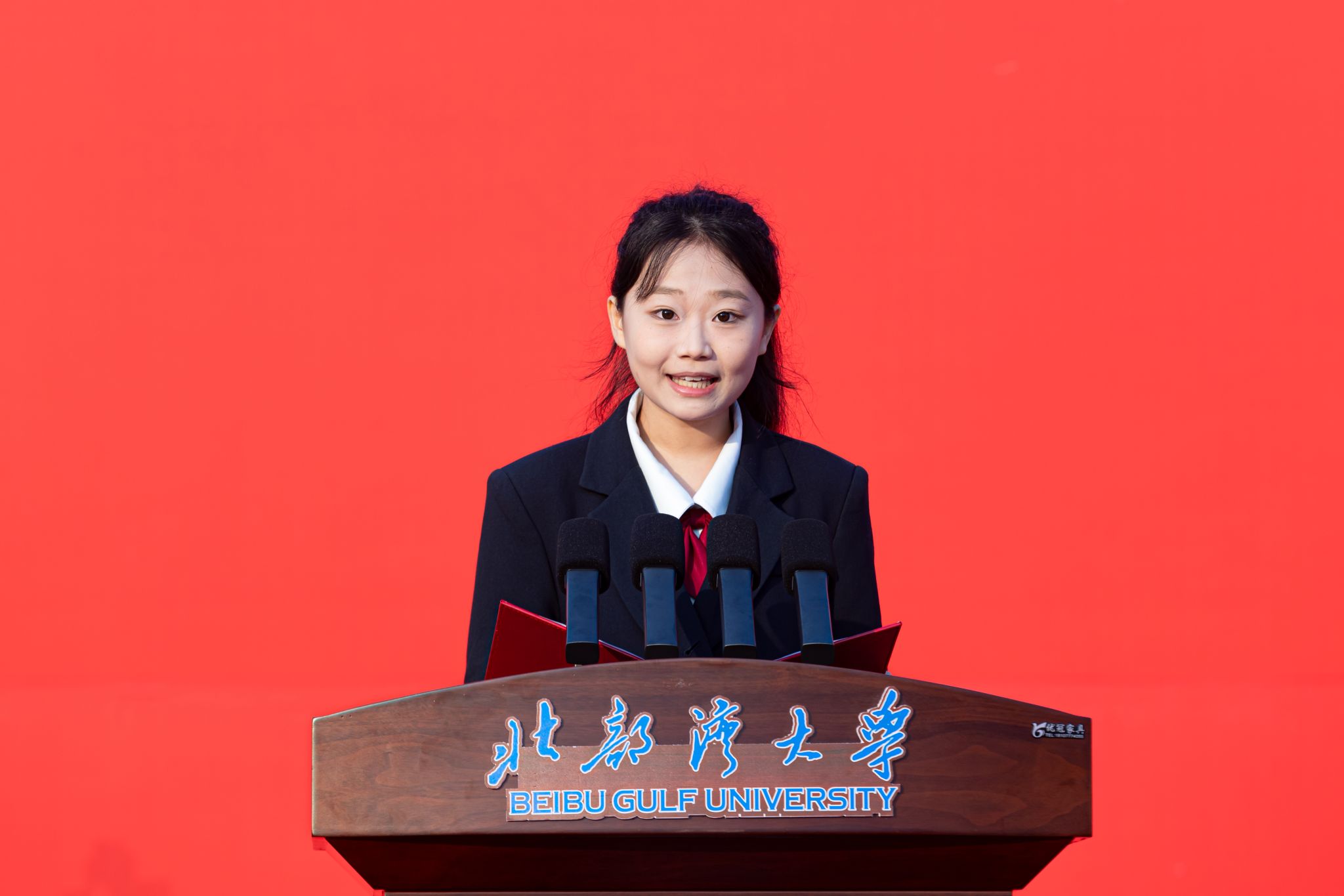 学校马克思主义学院教师邱静,经济管理学院城市管理专业23级学生贺睿希,钦州市义务教育教师代表施东娣作为师生代表上台发言。