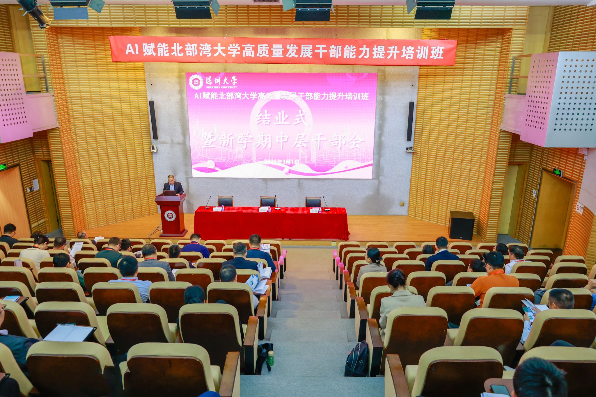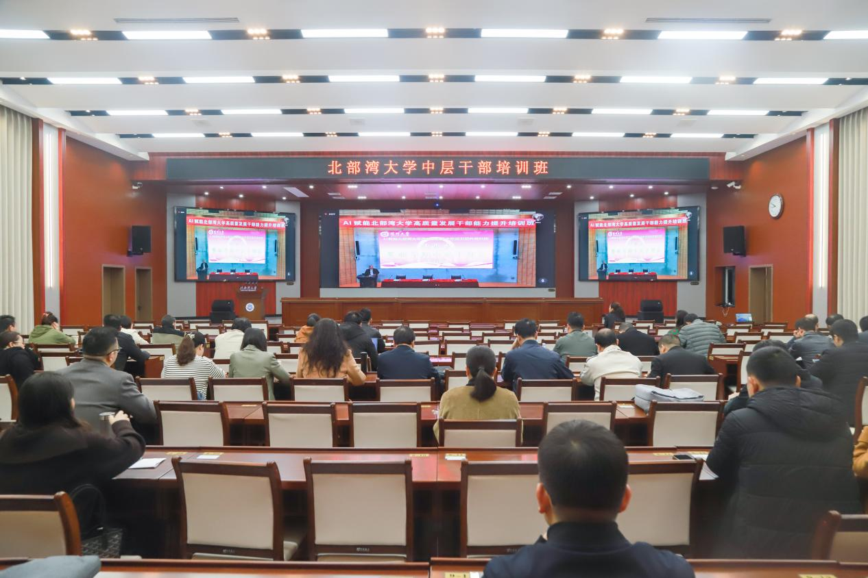 3月1日上午,AI赋能北部湾大学高质量发展干部能力提升培训班结业仪式暨中层干部会议在深圳大学粤海校区汇星楼一楼二号报告厅举行。校领导徐华蕊、苗剑、唐高华、陈磊、陆衡、马秀明、陈丹及全体中层干部、优秀教师代表参会。学校党委副书记唐高华主持。