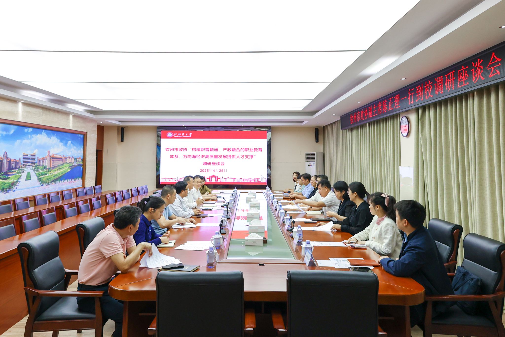 4月25日,钦州市政协副主席、九三学社钦州市委主委陈正理率调研组到我校开展“构建职普融通、产教融合的职业教育体系,为向海经济高质量发展提供人才支撑”专题调研。校党委常委、副校长闫松银主持调研座谈会。