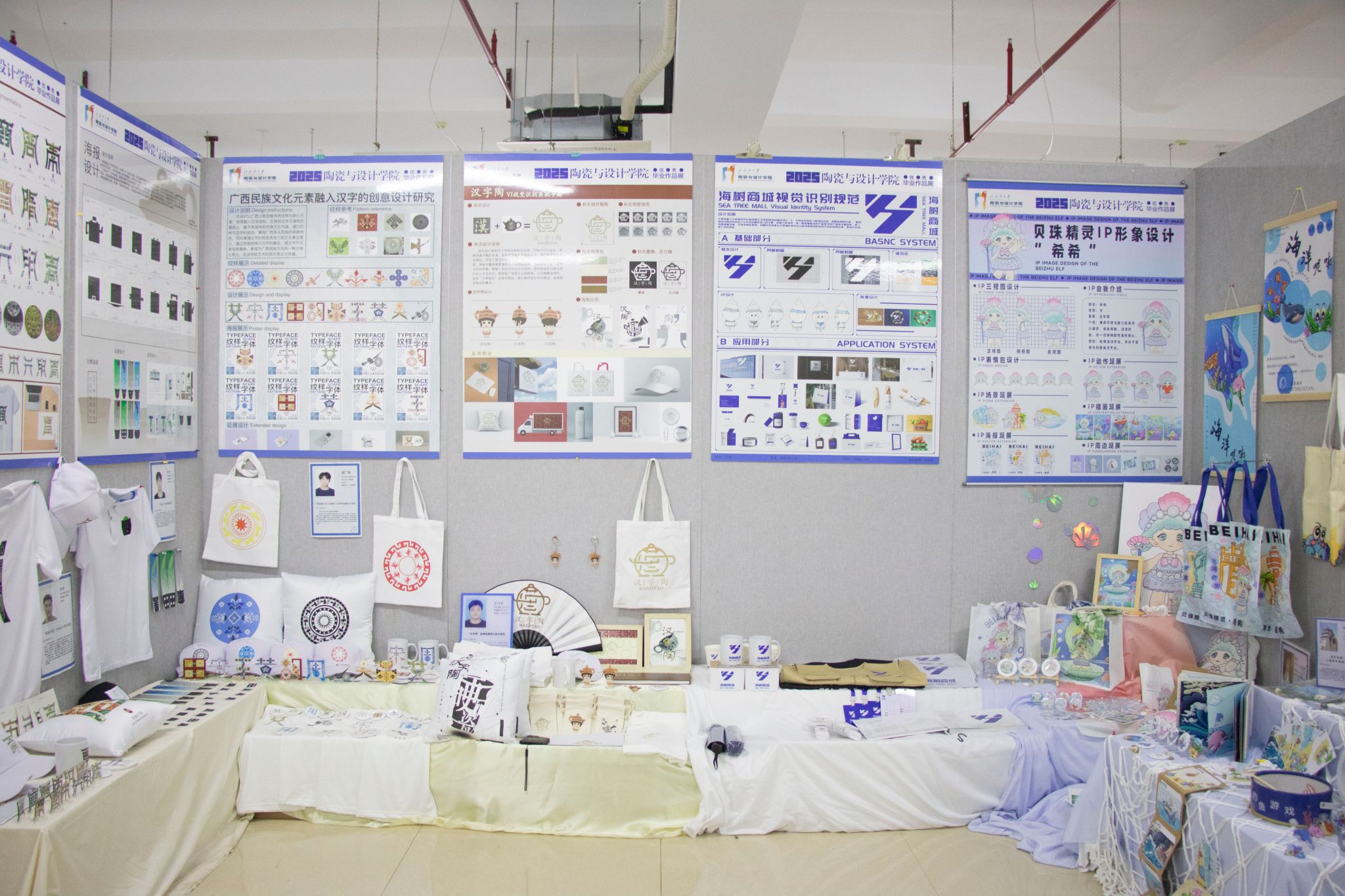 展览以平陆运河文化传承与创新为主线,以运河生态、历史文脉、城乡发展为脉络,汇集2025届视觉传达设计、环境设计、产品设计、美术学4个专业335名毕业生的335件/套作品,既有传统陶瓷技艺的匠心呈现,亦有数字媒体、智能交互等前沿技术的融合探索。视觉传达设计专业通过动态影像与品牌视觉系统重构运河文化符号,环境设计专业作品聚焦运河沿岸生态景观与文旅空间规划,产品设计专业将运河元素融入陶瓷器型与釉彩创新,美术学专业以国画、版画、油画、水彩画等形式再现运河人文风貌。展出作品通过多元艺术形式展现了平陆运河的历史底蕴与时代价值,彰显了湾大青年学子扎根地域文脉、践行创新使命的责任担当。(李美晴 苏渝岚 摄)